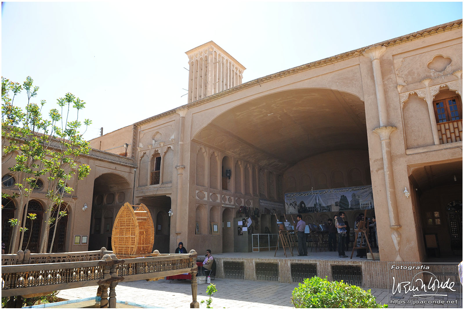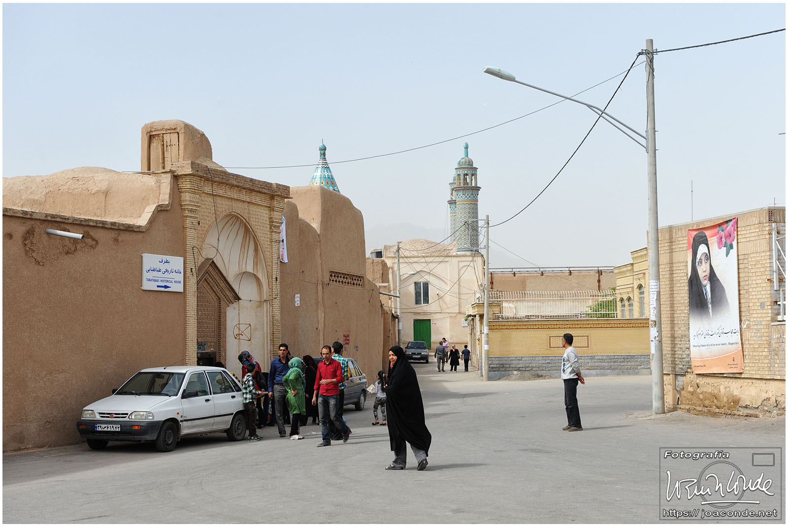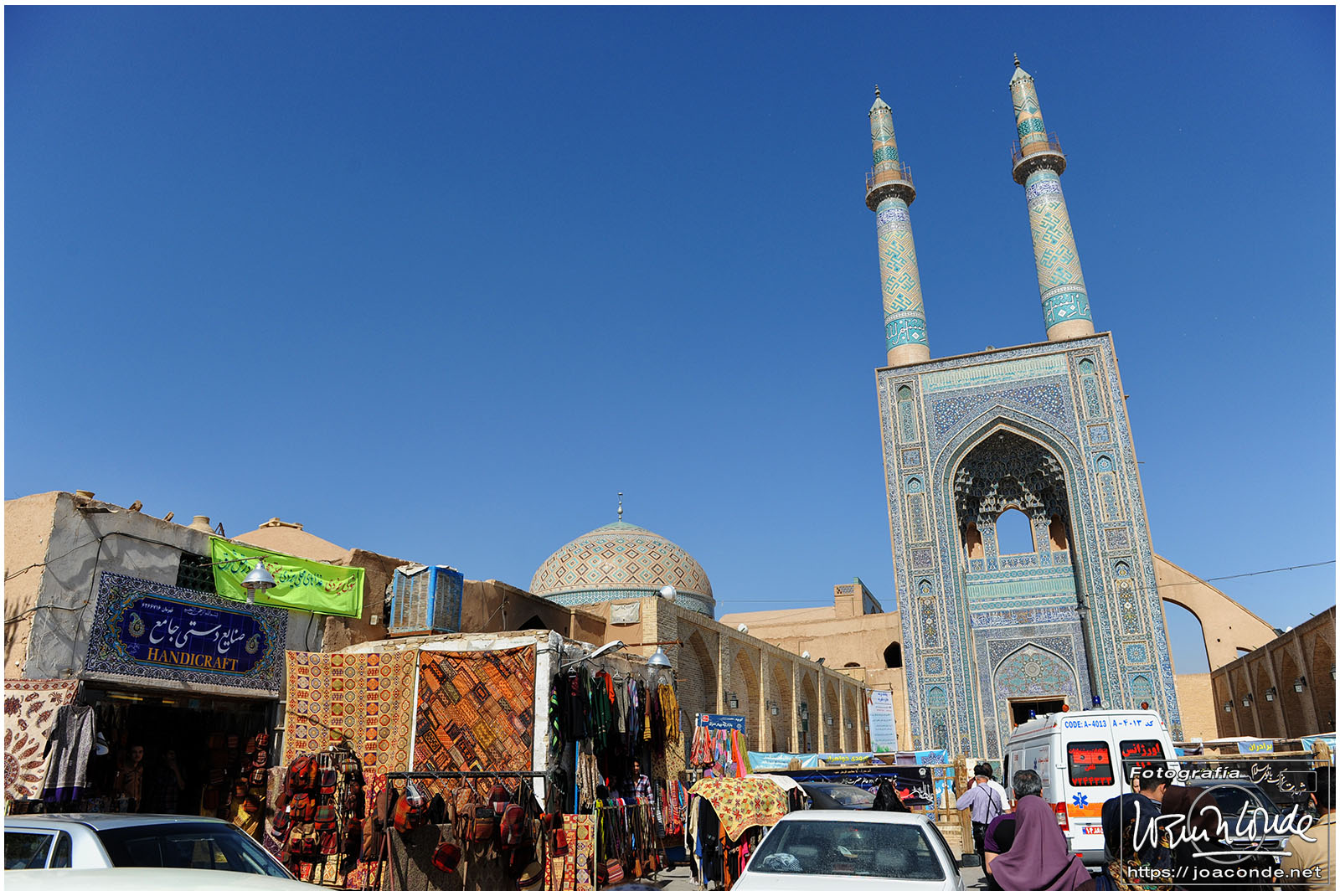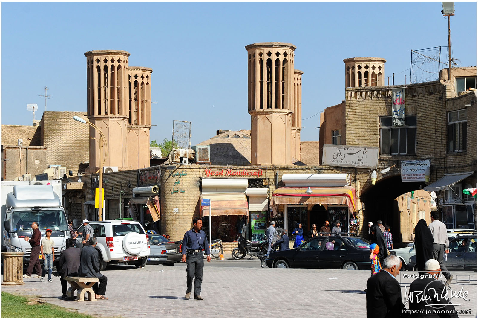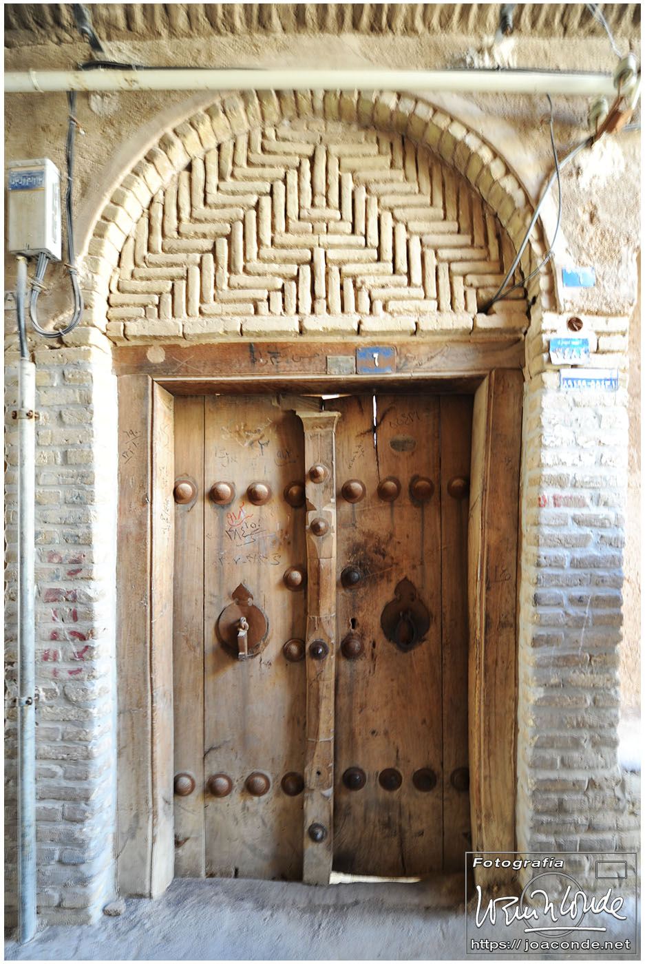 Vimos que las puertas de las casas tenían dos llamadores, uno con sonido más recio, para uso de los hombres; otro de sonido más sutil, para las mujeres. La señora de la casa debía saber de qué sexo era quién llamaba a la puerta, para estar vestida de acuerdo con la ley. Entramos en una de esas casas, Khan-e Lari, pero solo en un par de habitaciones y no se podían hacer fotos; dentro había también varios puestos de artesanía.