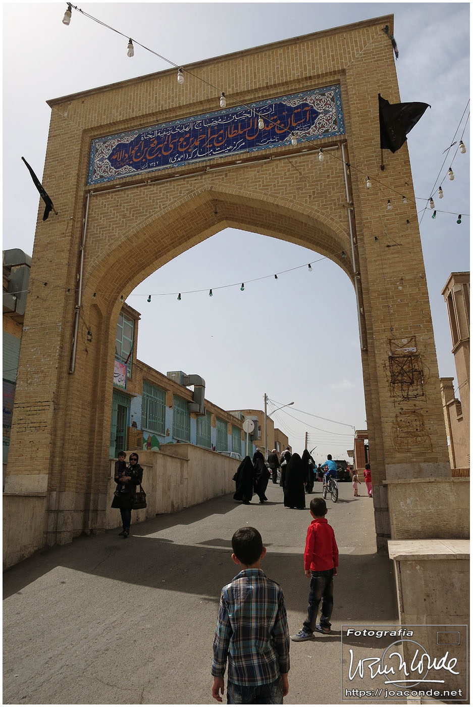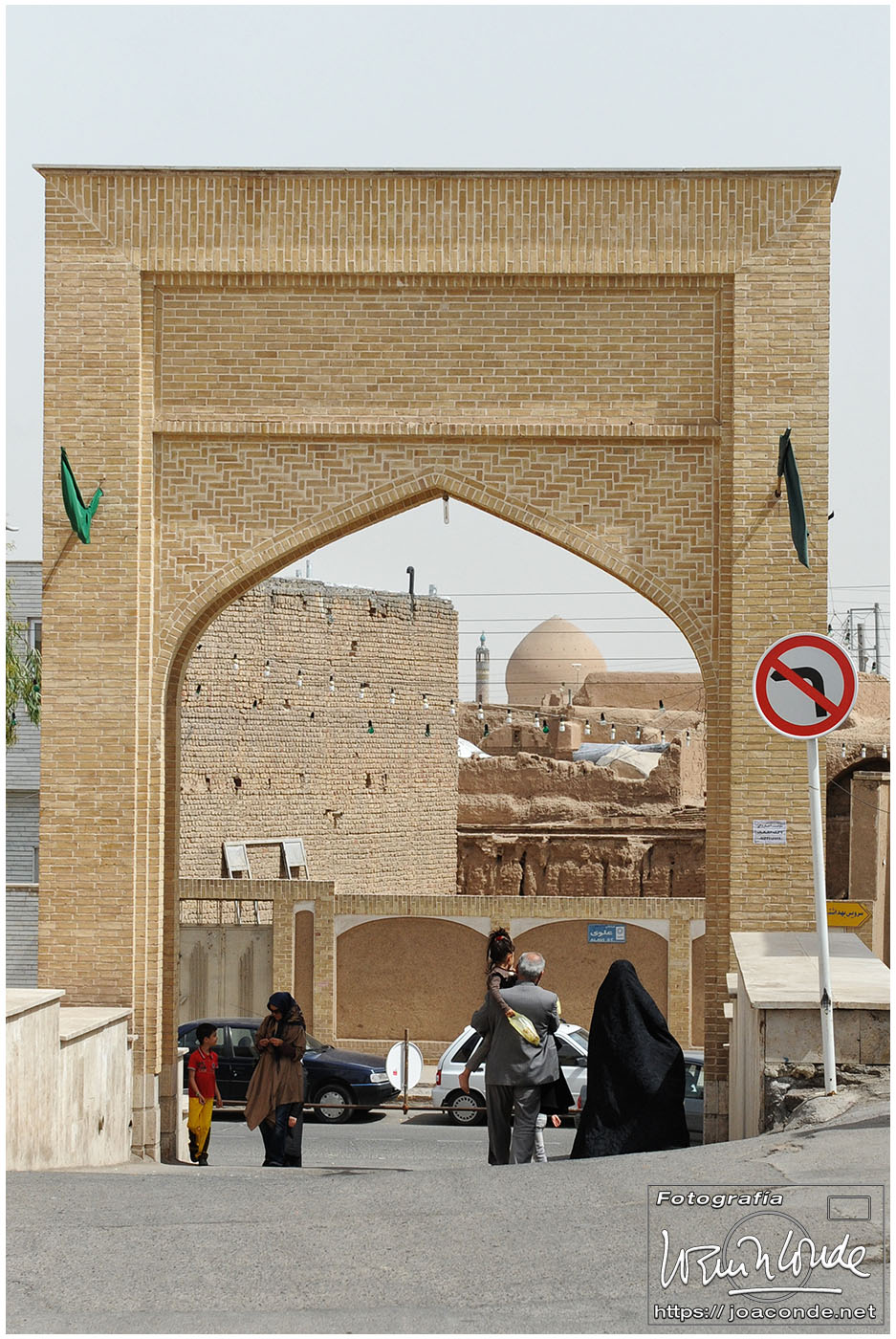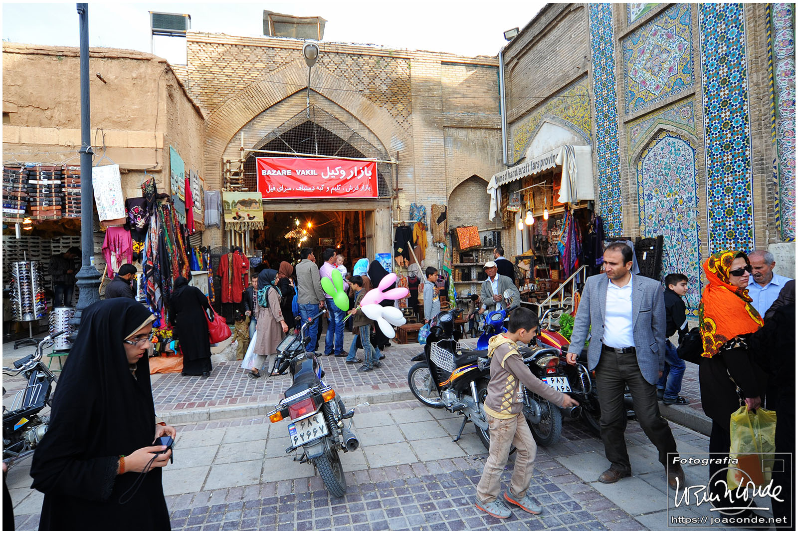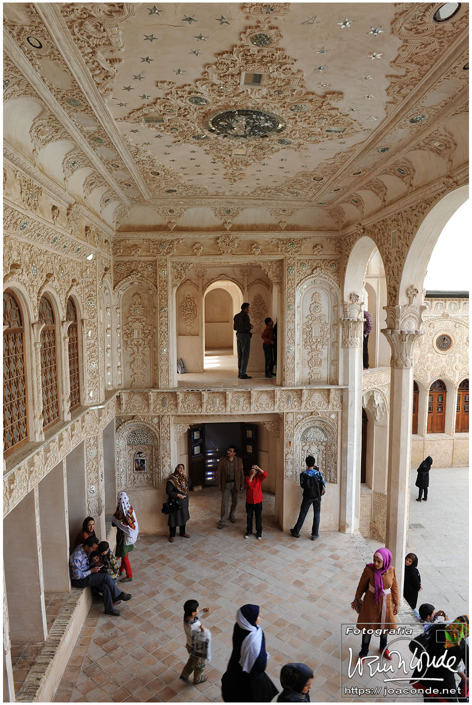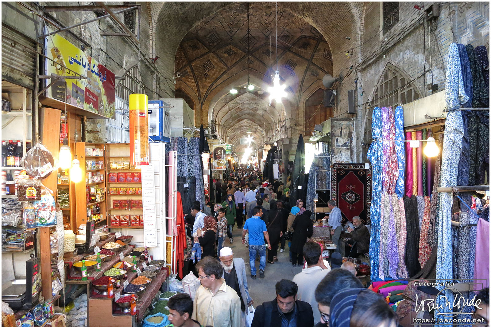 Vimos que las puertas de las casas tenían dos llamadores, uno con sonido más recio, para uso de los hombres; otro de sonido más sutil, para las mujeres. La señora de la casa debía saber de qué sexo era quién llamaba a la puerta, para estar vestida de acuerdo con la ley. Entramos en una de esas casas, Khan-e Lari, pero solo en un par de habitaciones y no se podían hacer fotos; dentro había también varios puestos de artesanía.