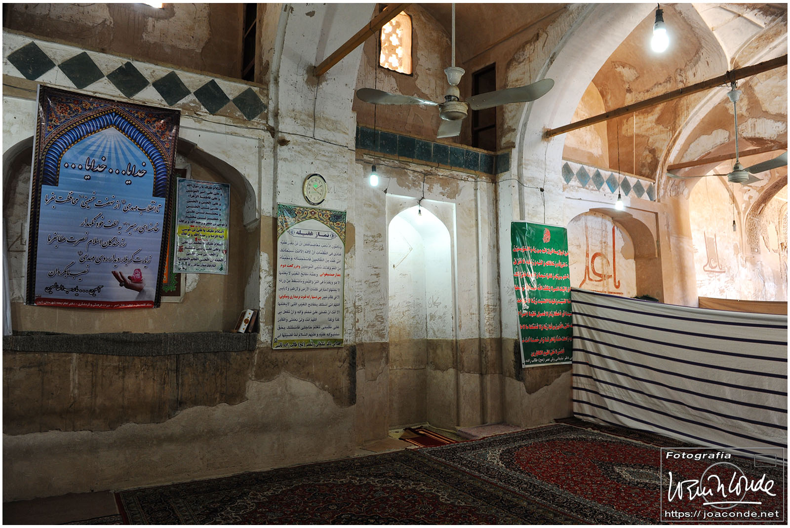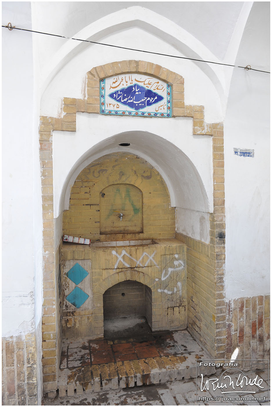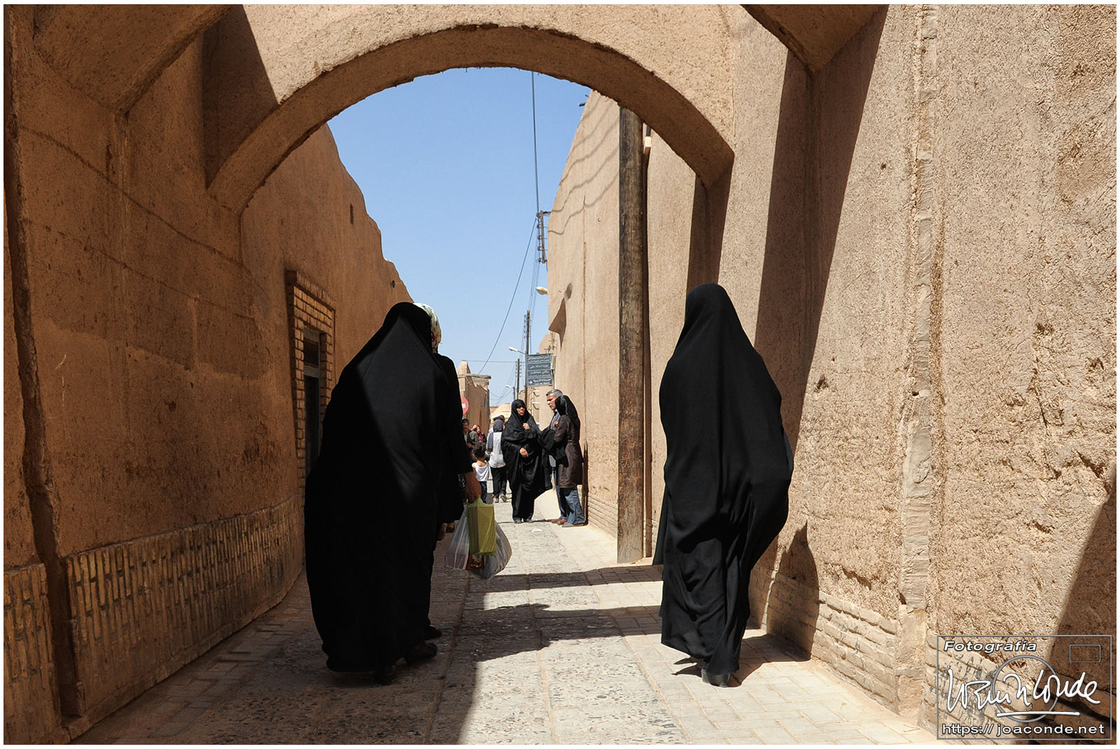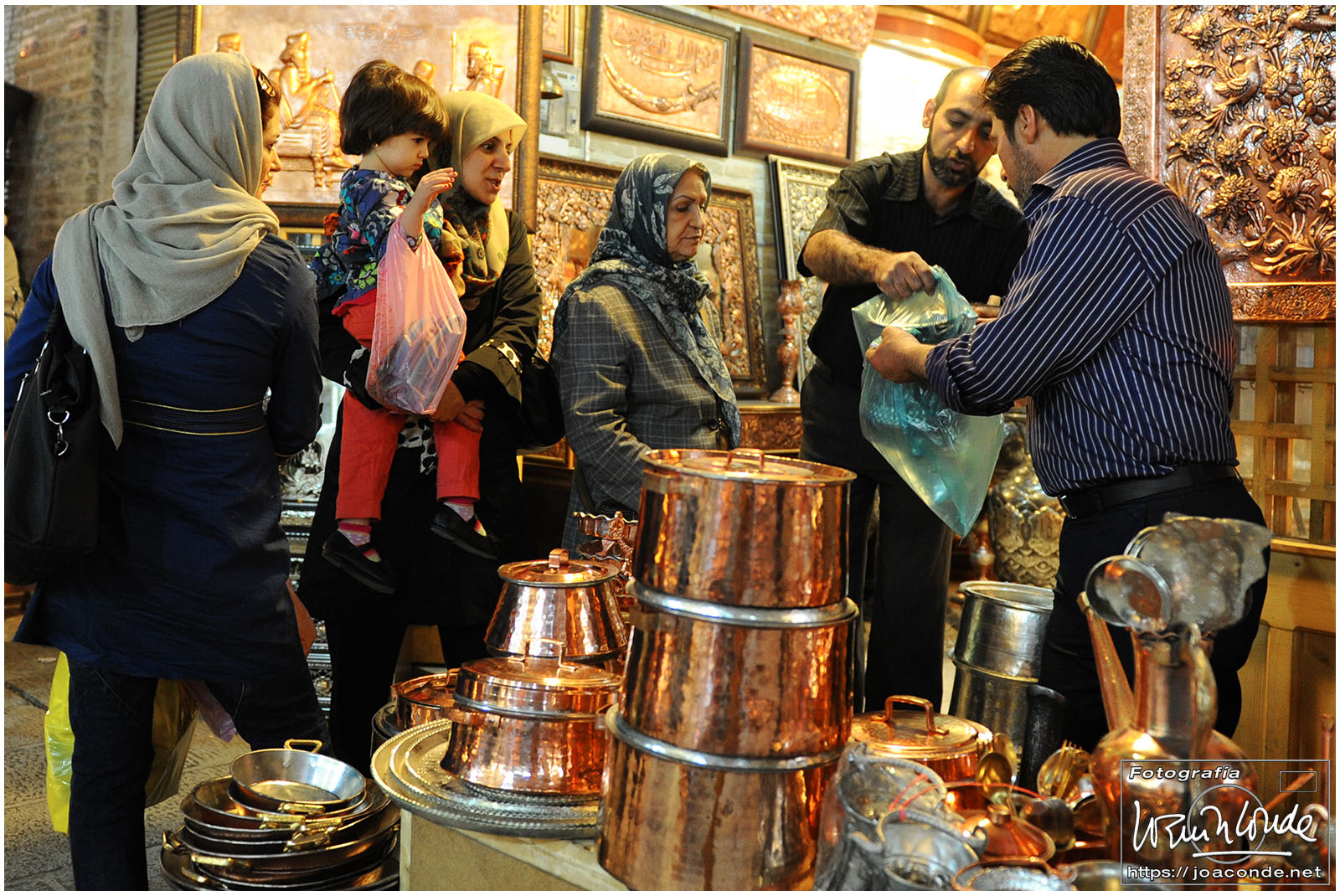 Vimos que las puertas de las casas tenían dos llamadores, uno con sonido más recio, para uso de los hombres; otro de sonido más sutil, para las mujeres. La señora de la casa debía saber de qué sexo era quién llamaba a la puerta, para estar vestida de acuerdo con la ley. Entramos en una de esas casas, Khan-e Lari, pero solo en un par de habitaciones y no se podían hacer fotos; dentro había también varios puestos de artesanía.