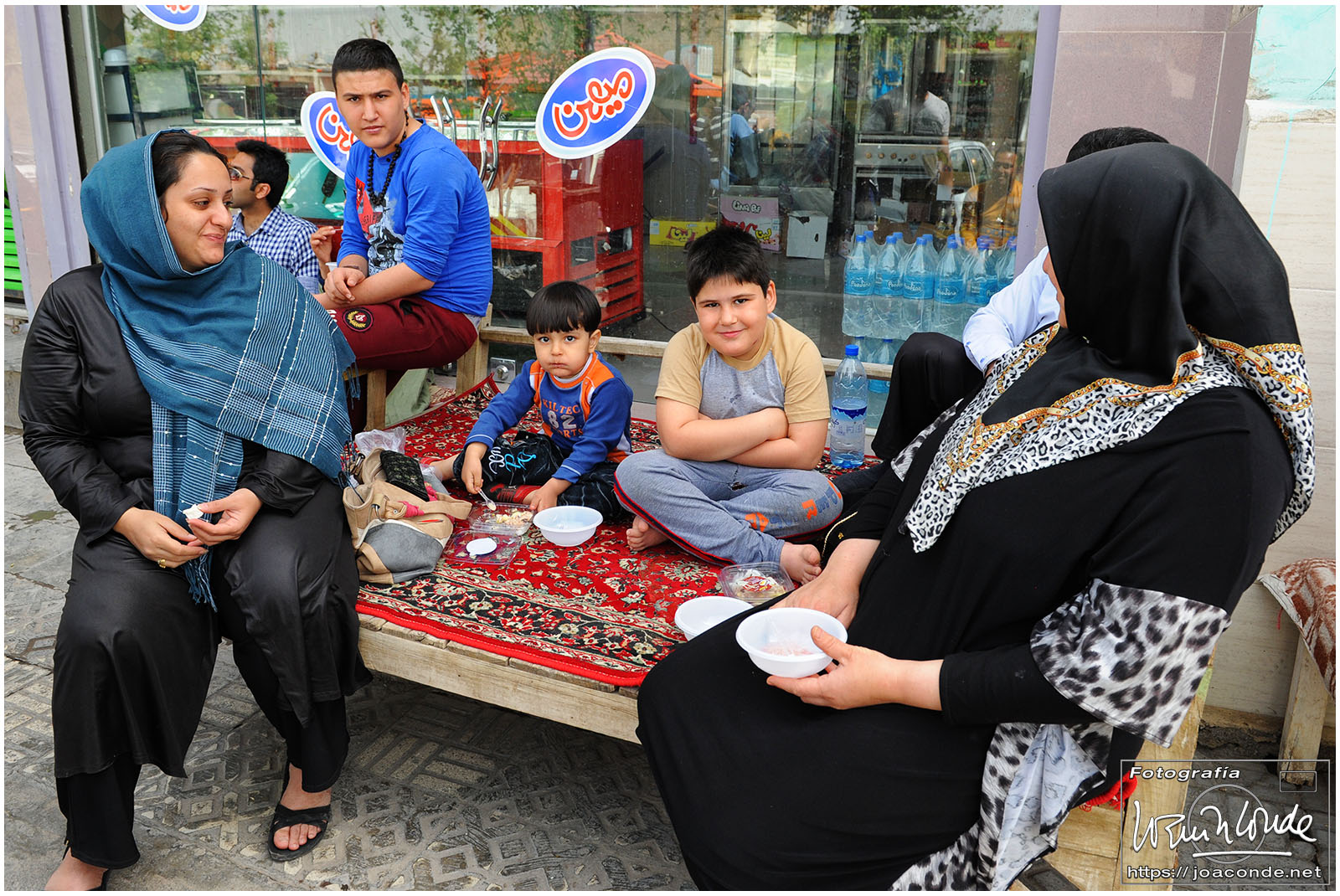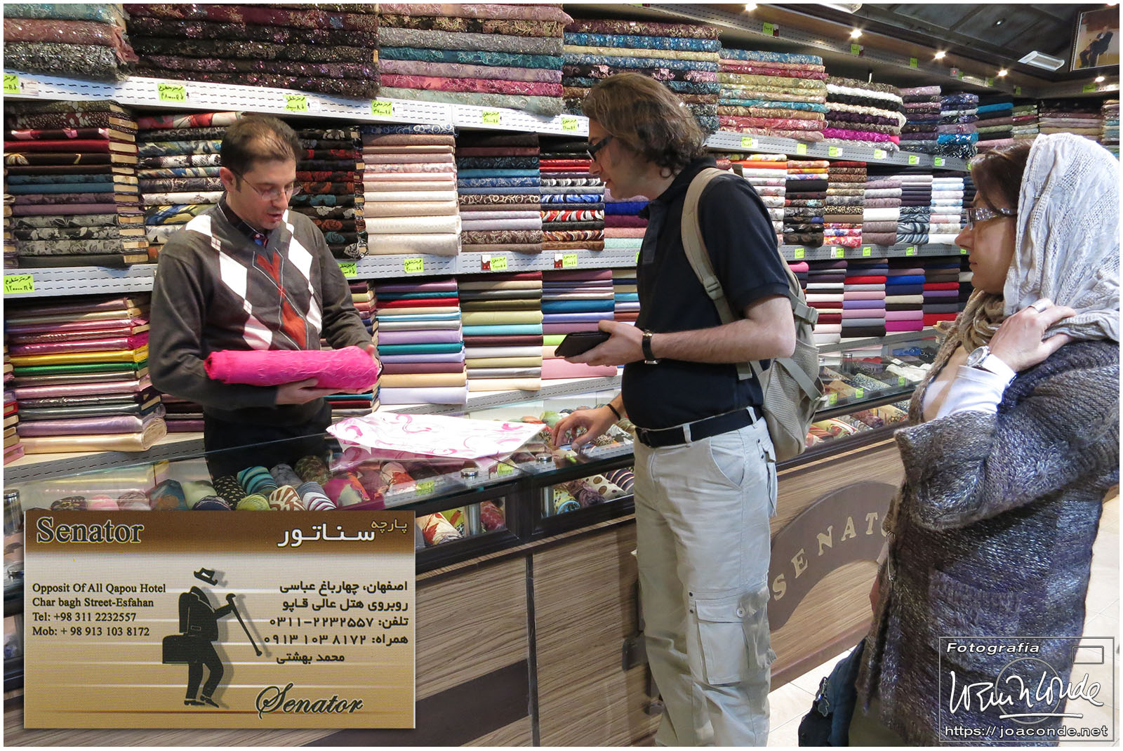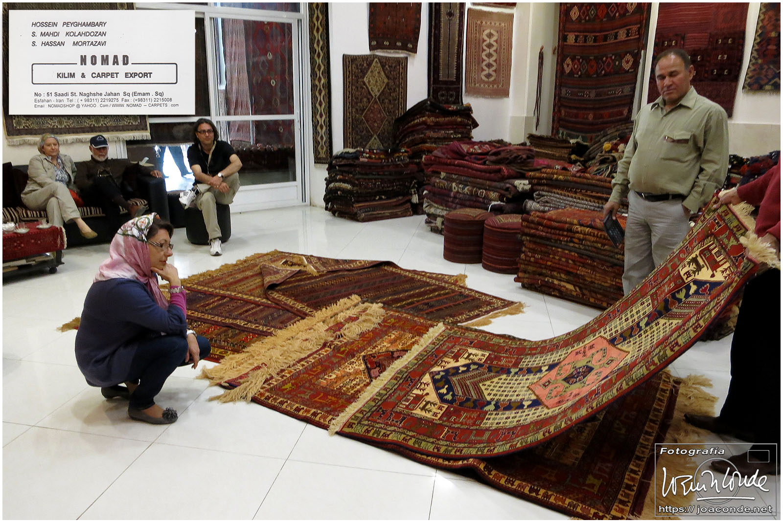 Después de comer, pasamos la sobremesa con otro Hossein, buen amigo de Jalal. En Nomad, su comercio de alfombras, y con su familia, convivió Ana María Briongos, que describió sus experiencias en el libro «La cueva de Ali Baba». Entre sorbos de té, nos mostró lo mejor de su tienda y nos contó mil detalles de sus viajes a España, donde tenía varias tiendas. También nos refirió los apuros de los españoles en Irán, a los que solía prestar dinero, ya que las tarjetas de crédito allí tenían poquísima utilidad. Le compramos un tapiz y una alfombra preciosa, que le pagamos después desde España.