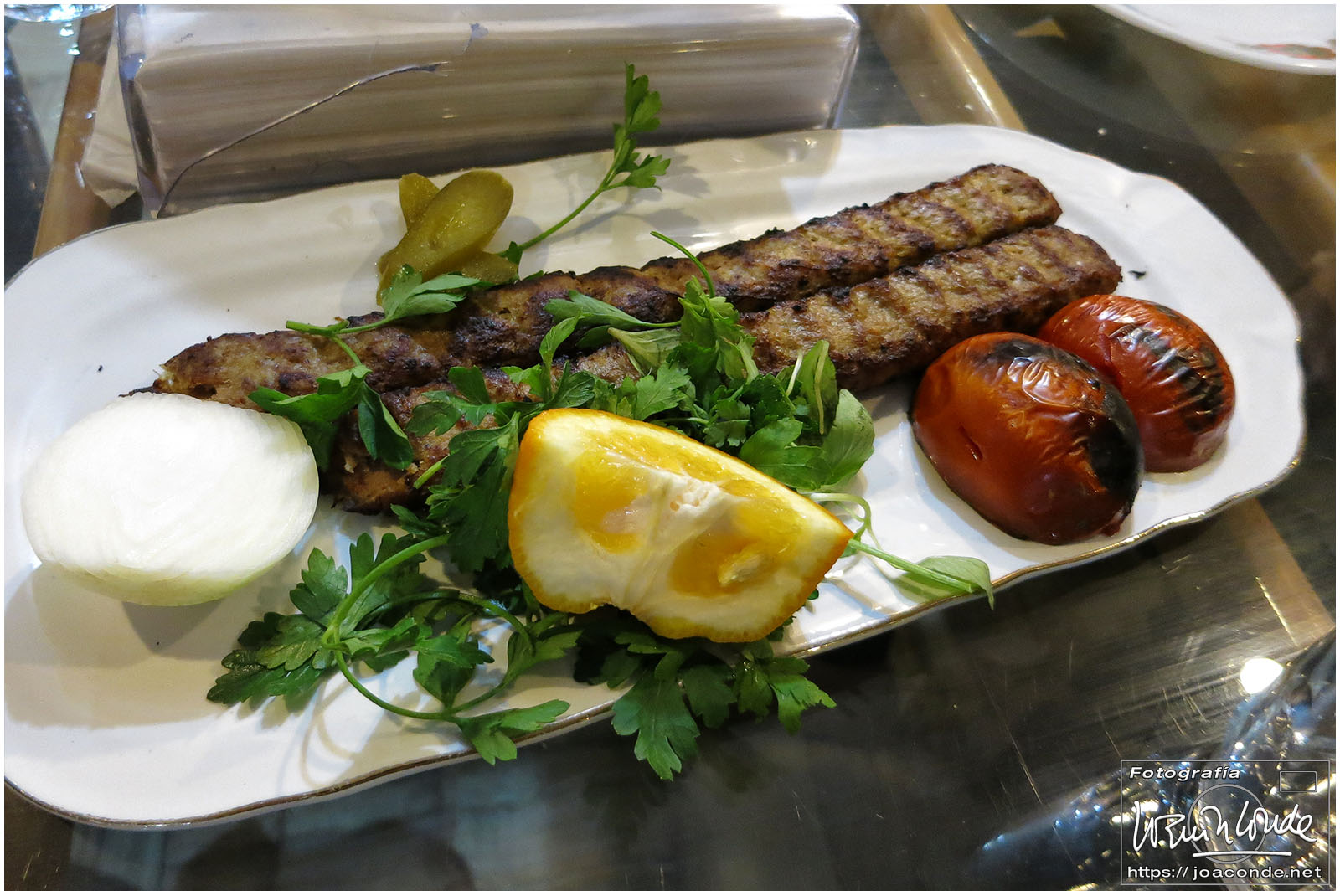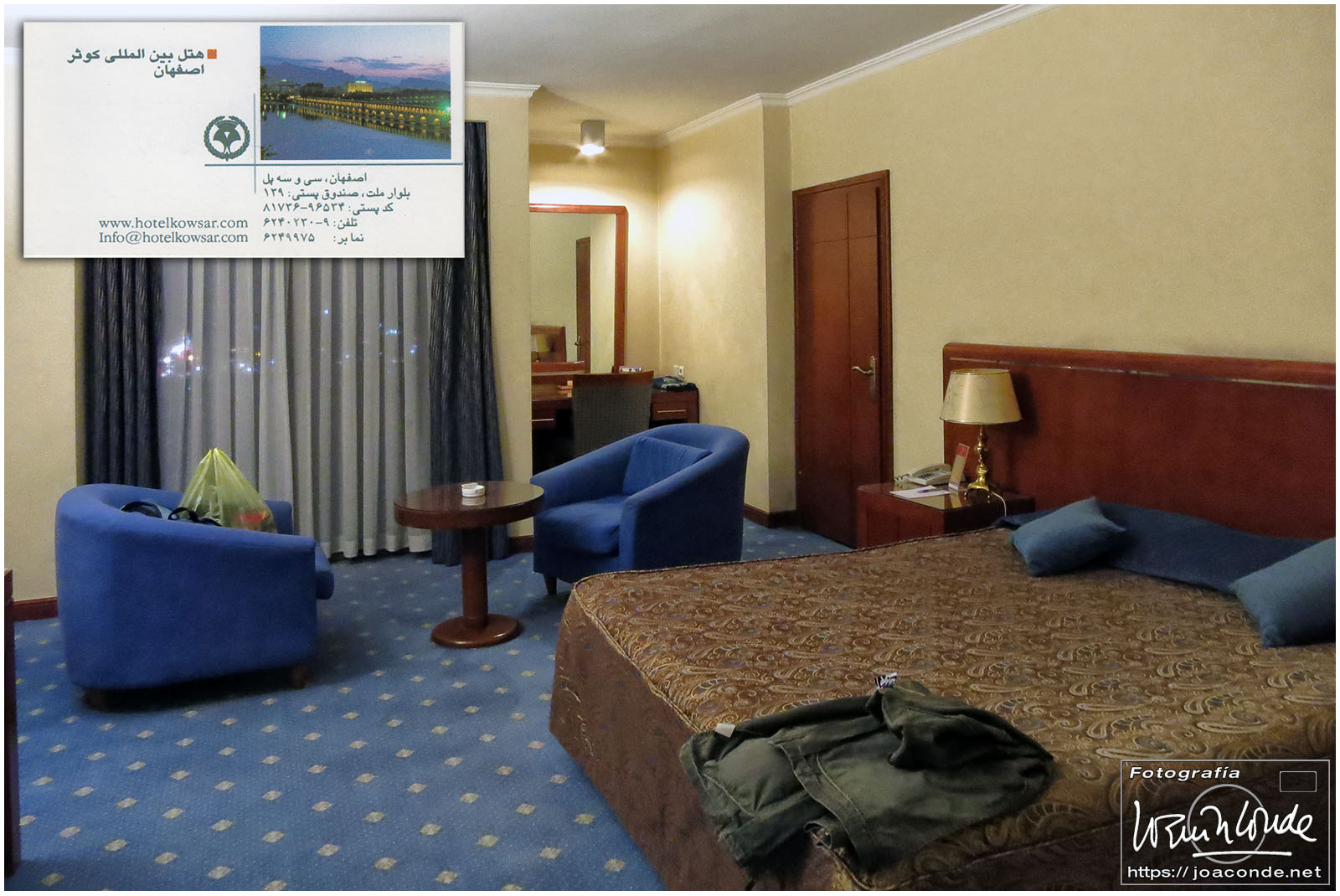 Llegamos ya de noche y la primera vista desde la habitación del hotel Kowsar era espectacular. Salimos a ubicarnos; cruzamos el puente de los 33 arcos y cenamos lo de siempre: cordero y pollo a la brasa, verduras asadas y arroz. El pan era adictivo, y las Kaliber 0.0, al menos estaban fresquitas.