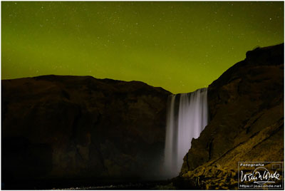 Después de 3 o 4 km por una pista sin dificultad, en la negra arena descansaban los restos del fuselaje de un viejo C-117 estadounidense. La iluminación del atardecer fue especialmente hermosa y nos permitió tomar decenas de fotos. Esa noche se esperaban auroras boreales. Sobre las 11, con un frío extremo, Santiago y yo fuimos a la cascada con nuestros frontales y equipos. Unos chicos alemanes iluminaban la montaña con sus linternas al ritmo que marcaba mi compañero… hasta que atrapé esa pequeña «aurorita».