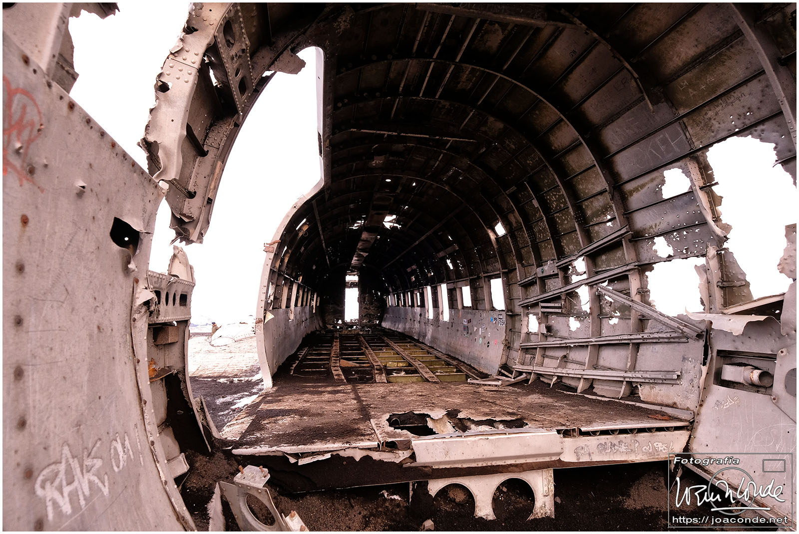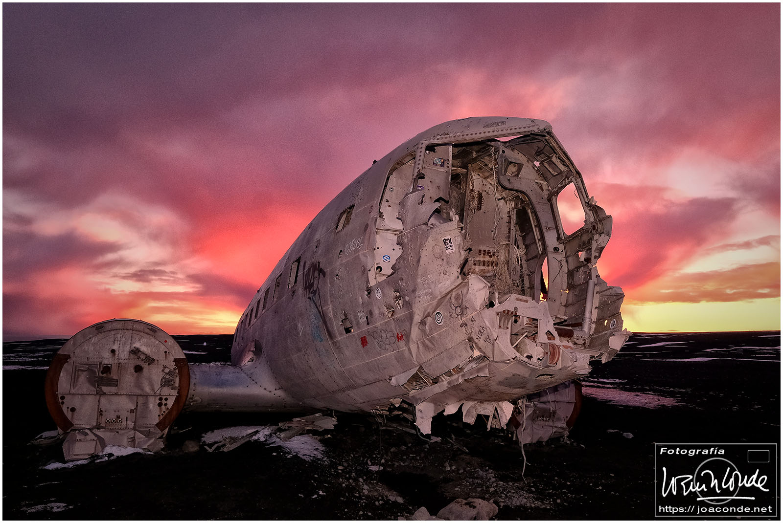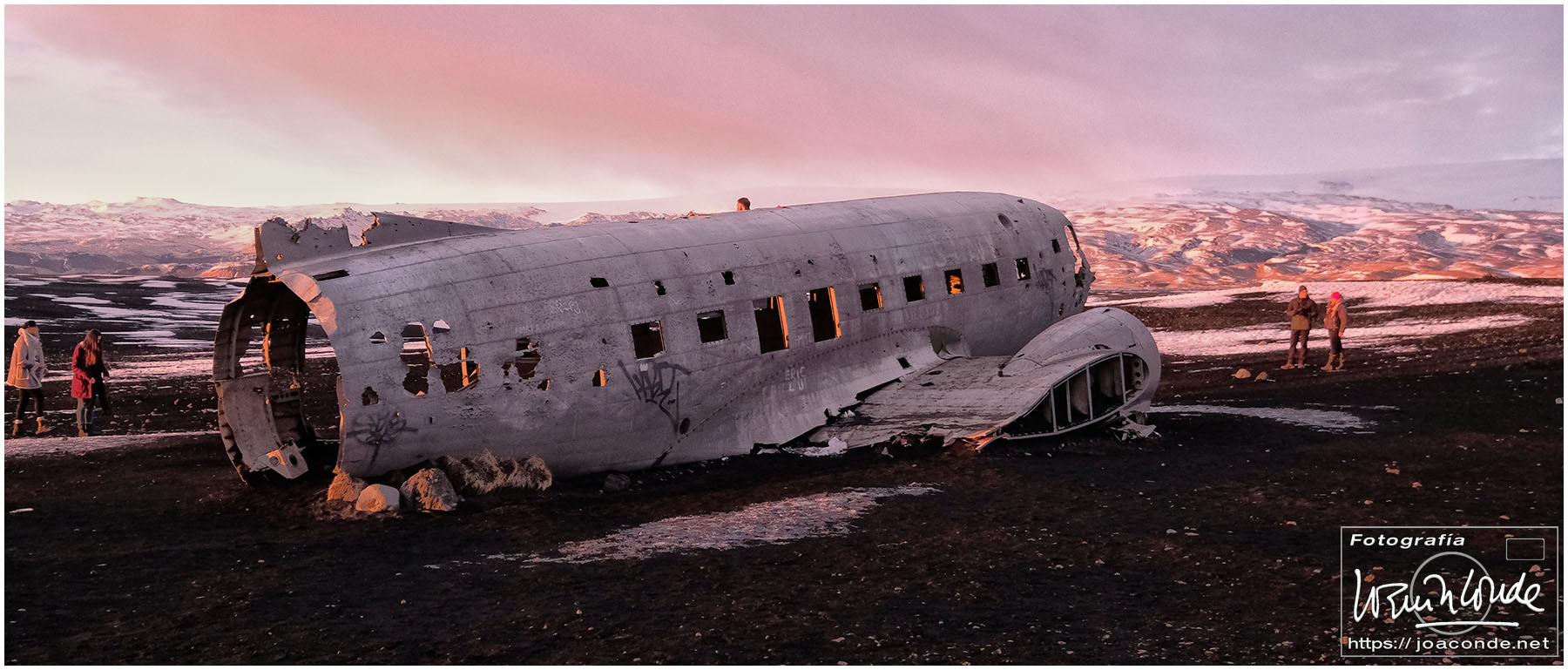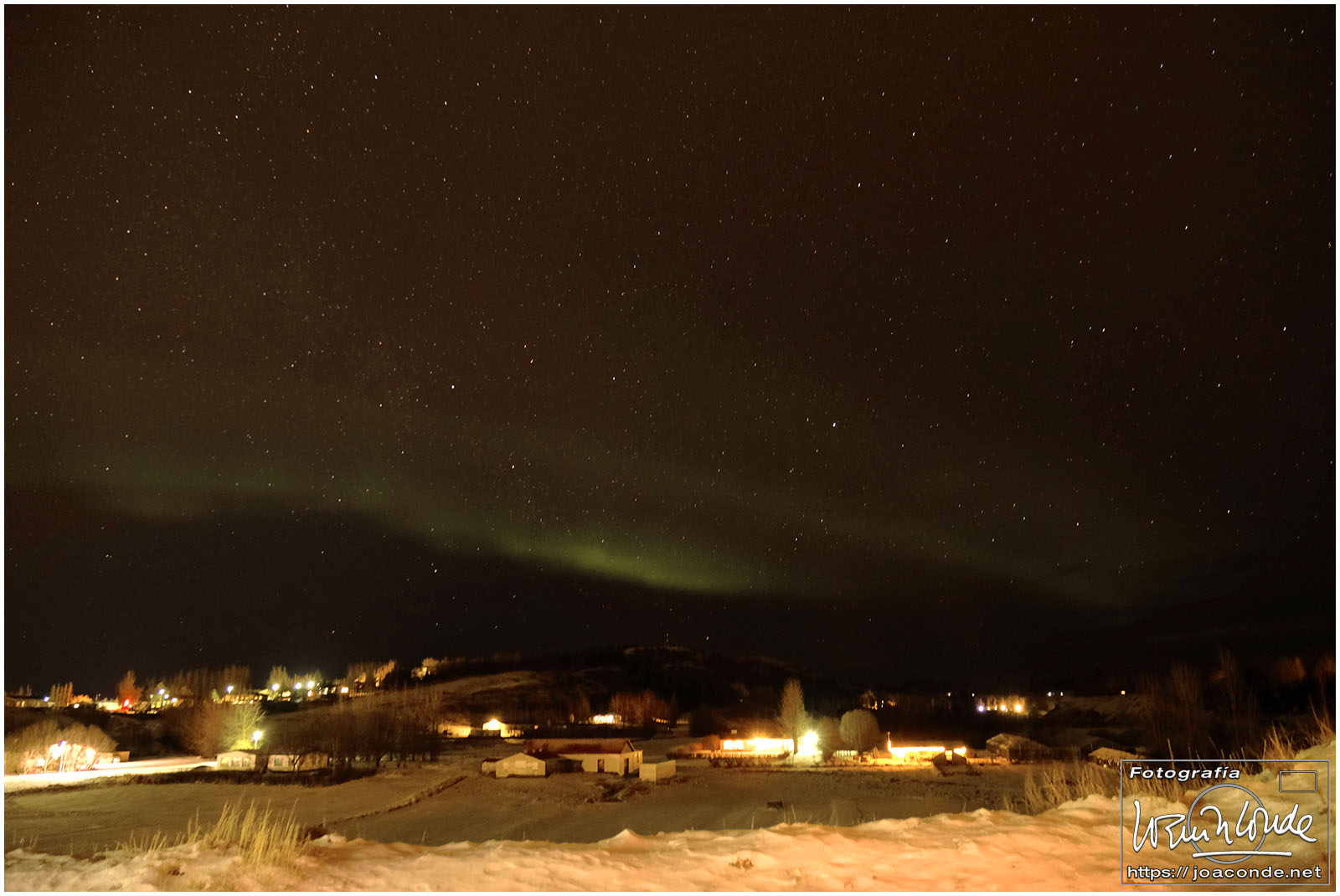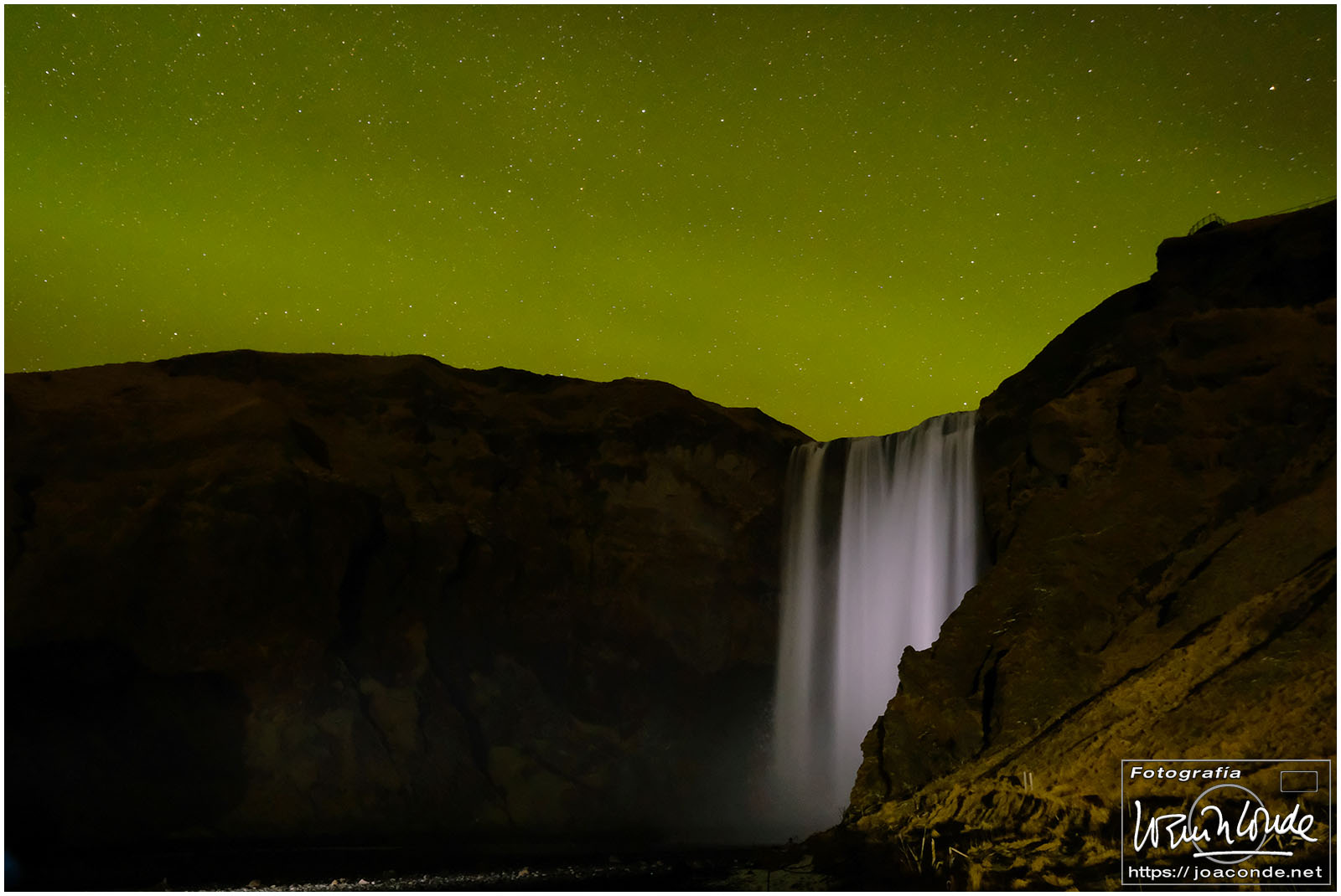 Después de 3 o 4 km por una pista sin dificultad, en la negra arena descansaban los restos del fuselaje de un viejo C-117 estadounidense. La iluminación del atardecer fue especialmente hermosa y nos permitió tomar decenas de fotos. Esa noche se esperaban auroras boreales. Sobre las 11, con un frío extremo, Santiago y yo fuimos a la cascada con nuestros frontales y equipos. Unos chicos alemanes iluminaban la montaña con sus linternas al ritmo que marcaba mi compañero… hasta que atrapé esa pequeña «aurorita».