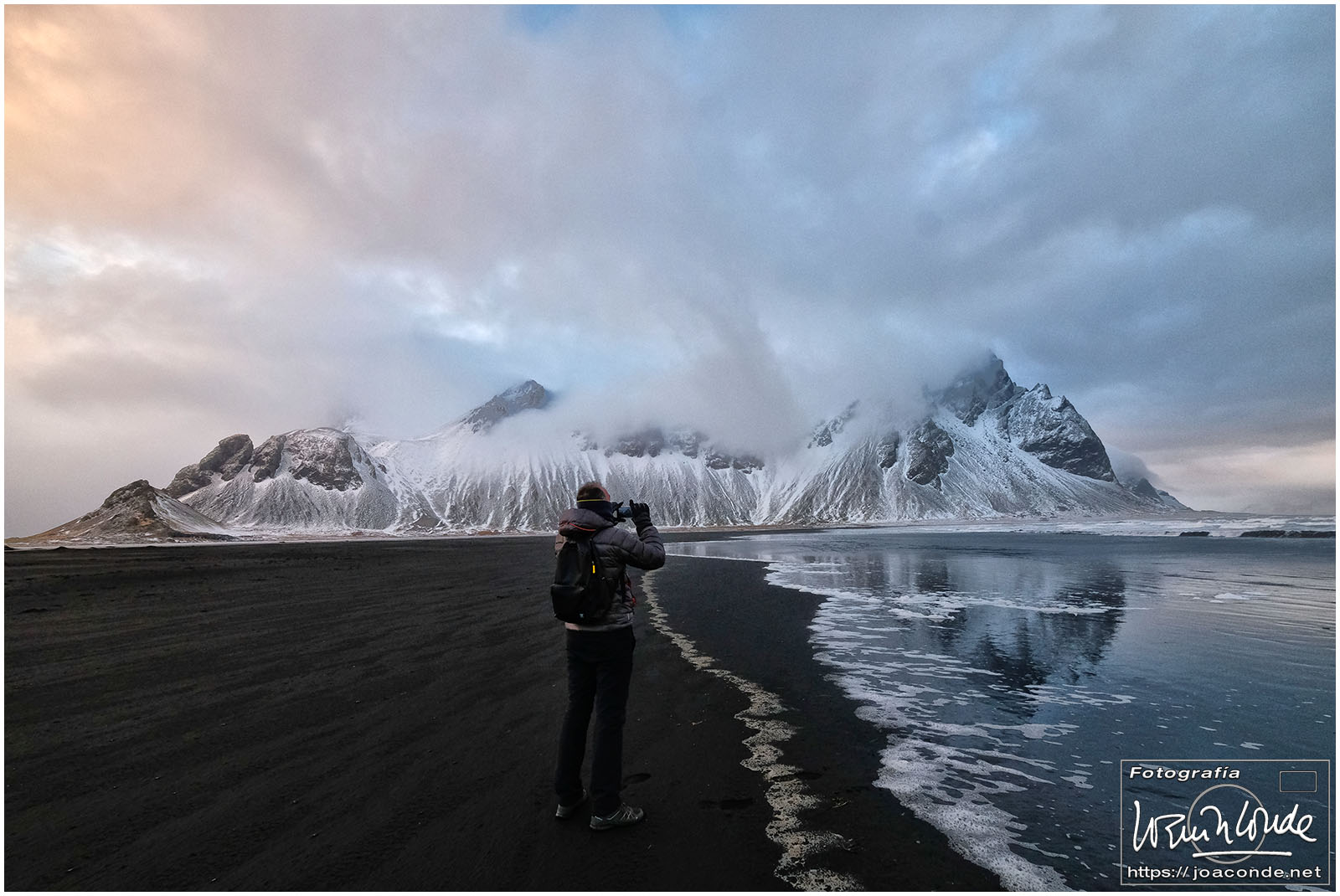 Después, dimos un paseo por el puerto, el colegio… y nos desplazamos a por la emoción fuerte del día: las montañas Stokksnes. Allí alucinamos con el contraste entre la arena y el hielo, y el espectáculo de las dunas… Gonzalo se puso a jugar con su dron y al rato empezó una granizada como nunca había visto: los granitos de hielo se me clavaban como perdigones y volví al hotel hecho una sopa.
