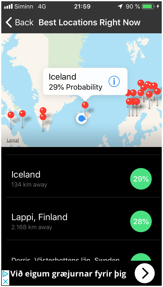 Más tarde nos acercamos a Geysir, y disfrutamos viendo varias erupciones del Strokkur. Cada cinco o diez minutos, del agua hirviente de la poza emergía una burbuja que proyectaba un chorro de agua y vapor a más de 20 metros de altura. Al llegar al hotel de Flúðir las aplicaciones decían que podíamos ver alguna aurora. Desde la puerta de nuestro bungaló, Santiago (excelente compañero de habitación) y yo salimos y tomamos varias fotos.
