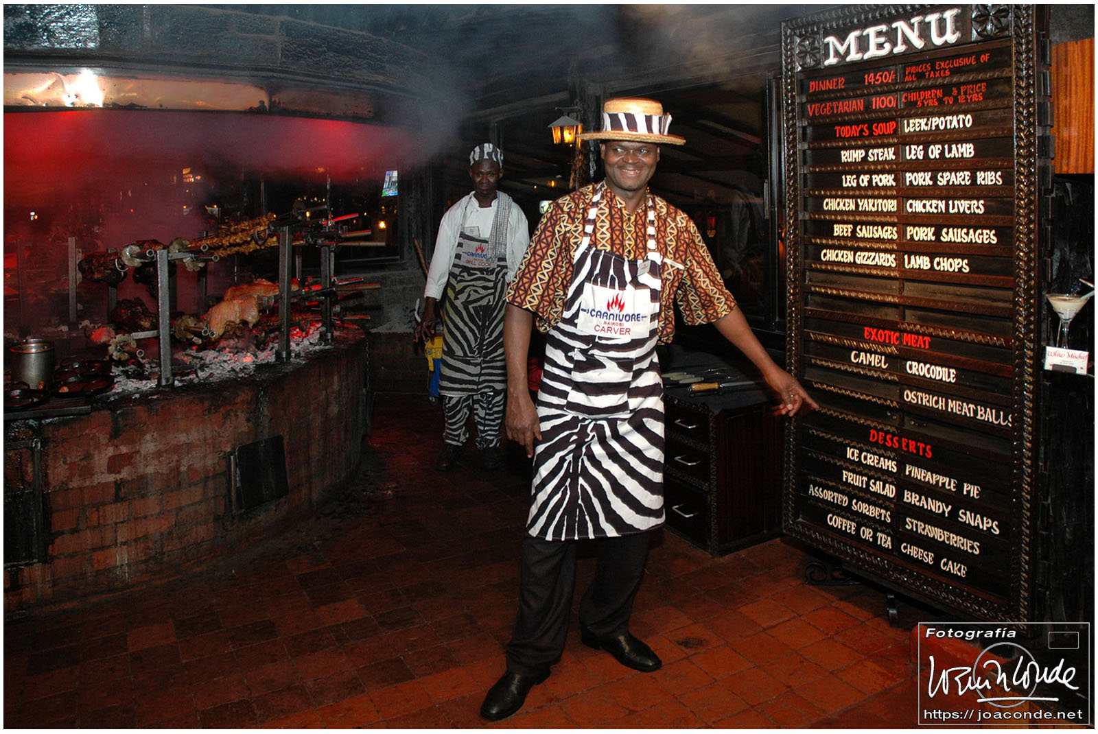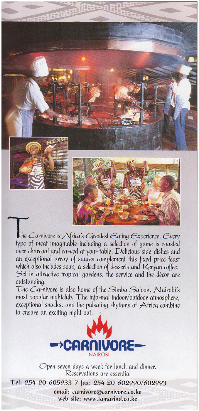 El viaje desde Masái Mara hasta el Lago Naivasha fue de más de seis horas, por caminos horribles y no llegamos hasta el mediodía. Con sus aguas dulces, era un hábitat perfecto para muchas especies: pelícanos, gansos del Nilo, águilas pescadoras… Lo cruzamos en un pequeño catamarán, observados de cerca por varios hipopótamos. En la zona de Crescent Island paseamos tranquilamente entre jirafas, cebras y ñus; en esta llanura se rodaron muchas escenas de «Memorias de África». De regreso a Nairobi, a las 7 de la tarde cenamos en The Carnivore, un restaurante para turistas, especializado en carnes.