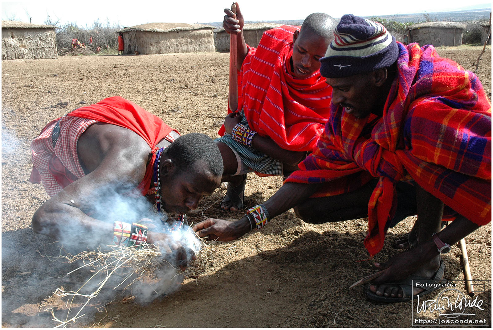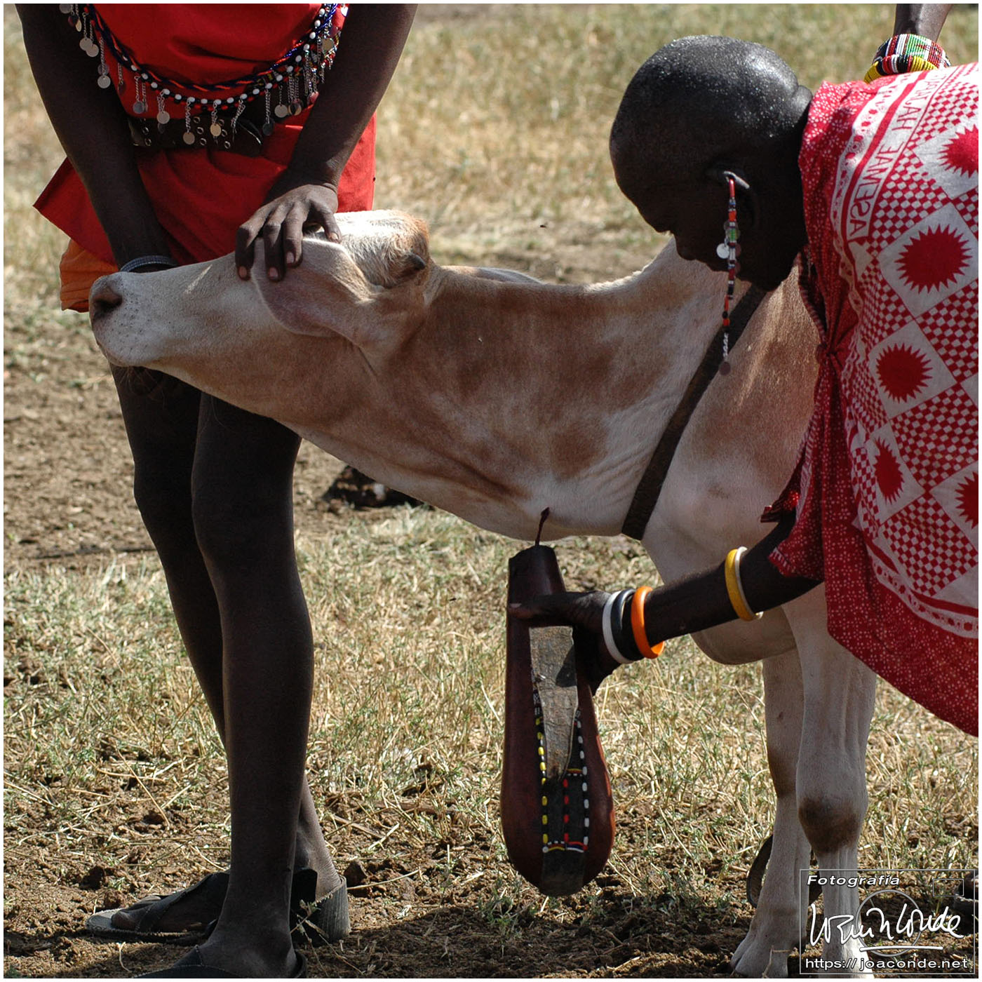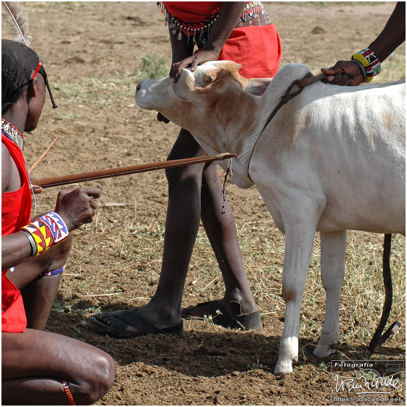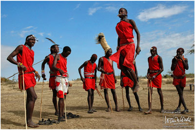 Ciertamente salir de safari a pie con los masái fue toda una experiencia. Nos movimos por una zona con pocos animales —¡mucho mejor!— y descubrimos huellas, termiteros, y toda clase de boñigas. Los jóvenes guerreros no dejaban de ofrecernos dientes de león, pulseras de pelo de elefante y toda clase de objetos rituales. Más tarde fuimos a un poblado, donde nos recibieron cantando y bailando como si hubieran cazado un león. Estos pastores se alimentaban básicamente de leche y sangre y nos hicieron una demostración de cómo preparaban el brebaje. Luís, un brasileño que hacía ese safari con nosotros, probó la pócima ¡y sobrevivió! También Samson, el magnífico guía que nos acompañaba, se tomó un chupito.