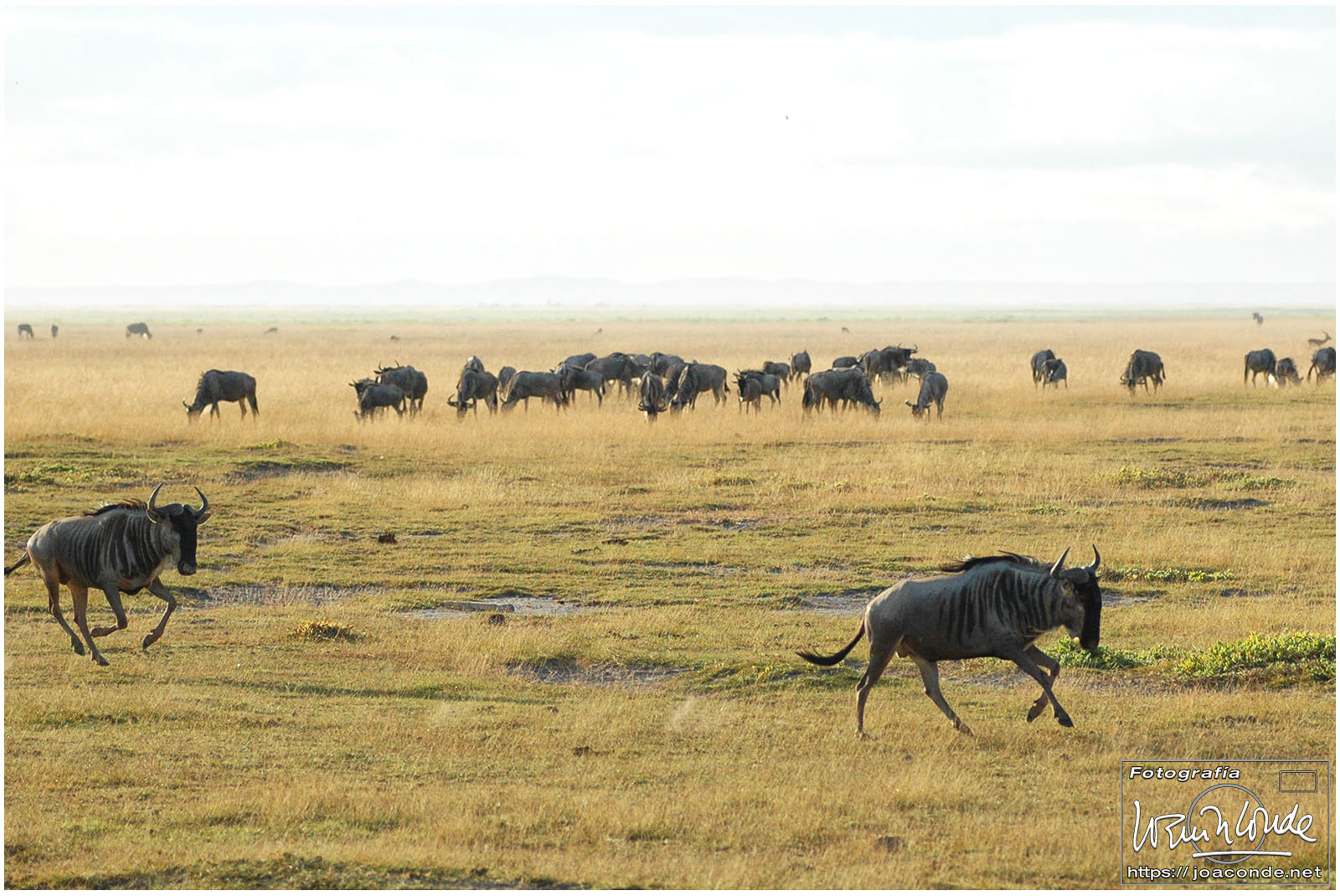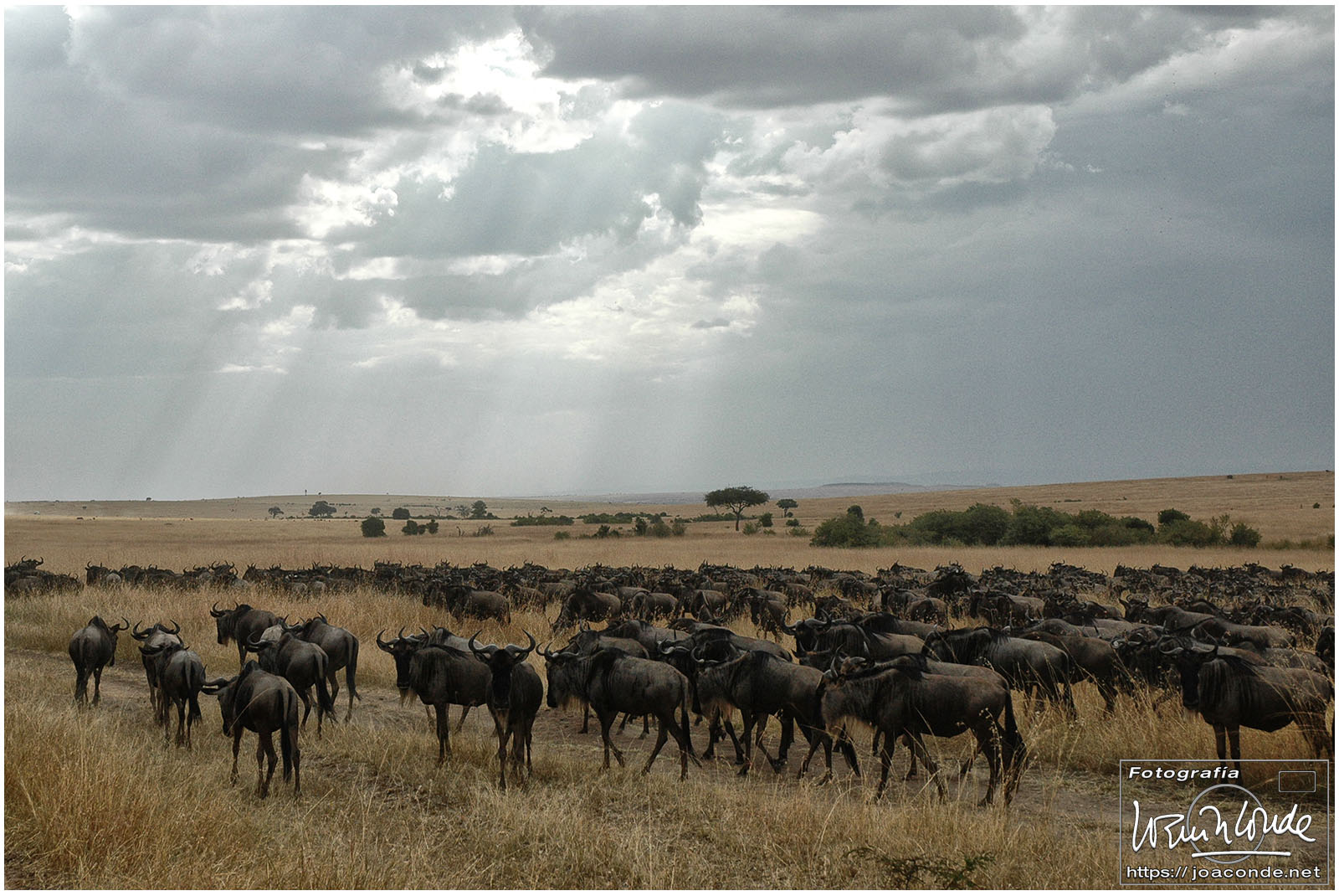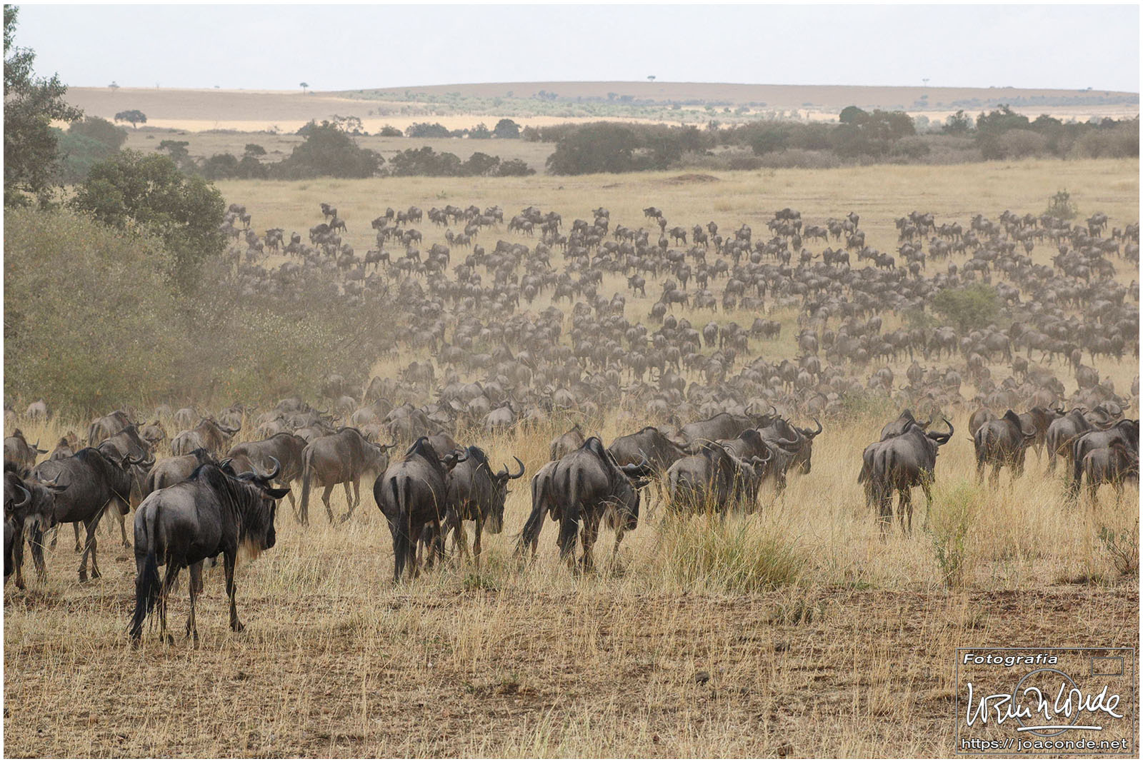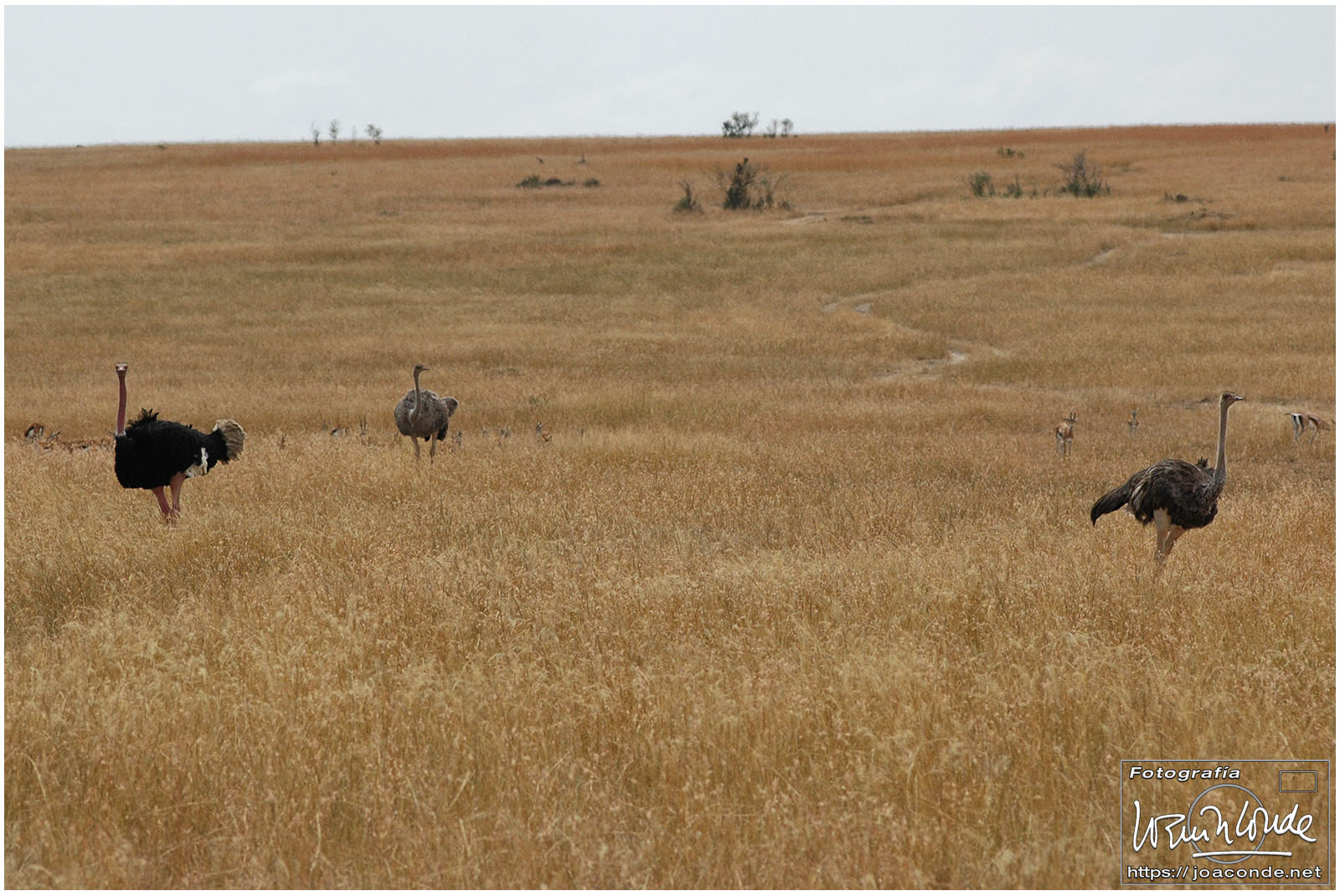 Seguimos el safari y vimos kongonis, buitres encaramados en los árboles, leones y también avestruces (siempre en pareja, el macho negro y blanco y la hembra parda). Hicimos muchísimos kilómetros campo a través en dirección al río Mara. Las manadas de ñus que encontrábamos acababan de cruzarlo y se encaminaban hacia las verdes praderas.