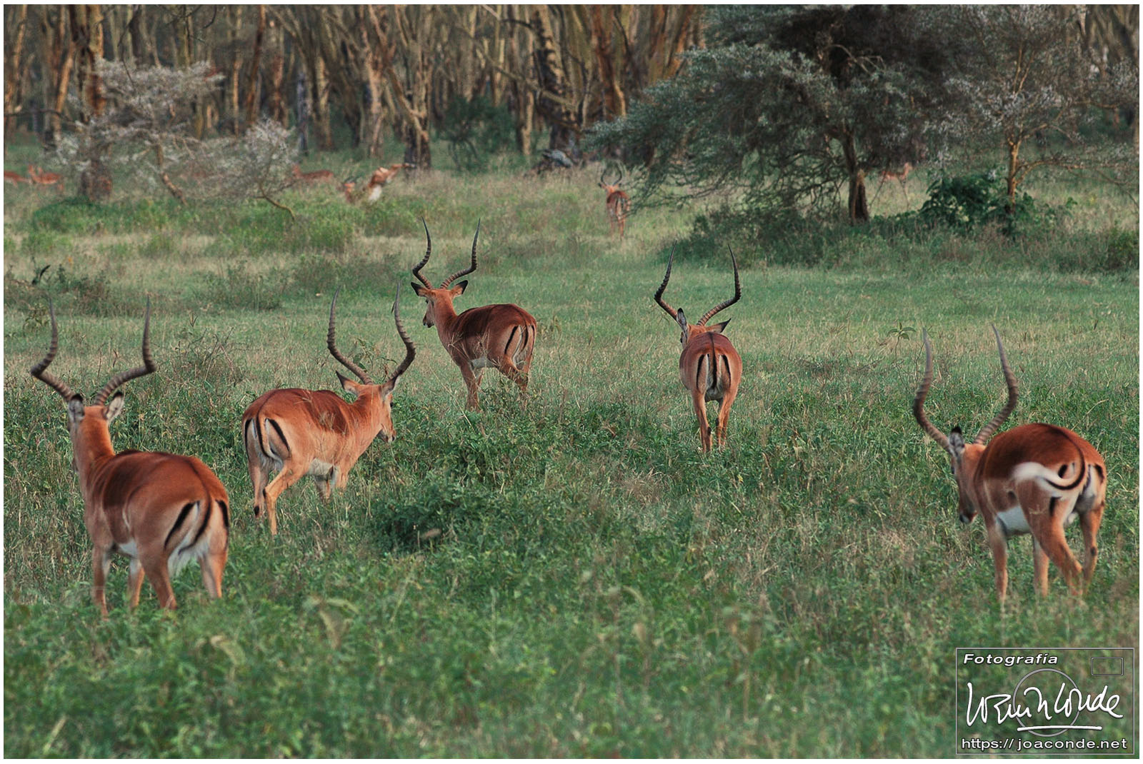El Lago Nakuru era conocido por los dos millones de flamencos que se alimentaban en sus aguas alcalinas. El parque nacional que rodeaba la laguna no era menos sorprendente: bosques de euforbias candelabro y acacias de tronco amarillo daban cobijo a cebras, elands, cobos de agua, colobos, impalas, jabalíes verrugosos, búfalos, rinocerontes, gacelas de Thompson, leones… y sobre todos, aquel leopardo que parecía pedirme que lo retratara.
