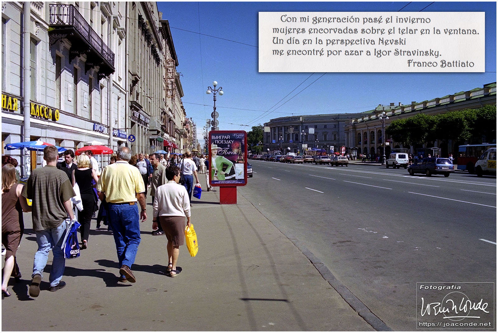 Después fuimos a la Iglesia de San Salvador sobre la Sangre Derramada, construida en el lugar donde murió en atentado el zar Alejandro II. Acabamos la tarde paseando por la Perspectiva Nevsky. Cuántas veces habría tarareado aquella canción de Battiato, y por fin me veía en esa enorme avenida… Volvimos al hotel de noche, pero a pleno sol. La playa estaba bastante animada cuando nos fuimos a la cama como las gallinas.