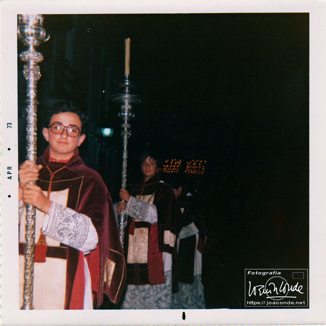 En 1970 me apuntaron a la «Congre» de San Hipólito, iglesia en la que hice de monaguillo durante varios veranos. También desfilaba en el cuerpo de acólitos de la Hermandad de la Buena Muerte. Con catorce años, en la primavera de 1973, hice mis primeras fotos en la Semana Santa de Córdoba, con una Instamatic 25 y un cuboflash. Como cabía esperar, las fotos salieron muy mal 🫤.