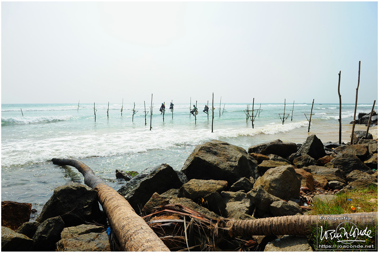 Siguiendo hacia Galle vimos varios grupos de pescadores subidos en estacas; eran la imagen típica de esta zona. Uno de ellos estaba en la playa recogiendo las propinas de los turistas que parábamos a hacerles fotos.