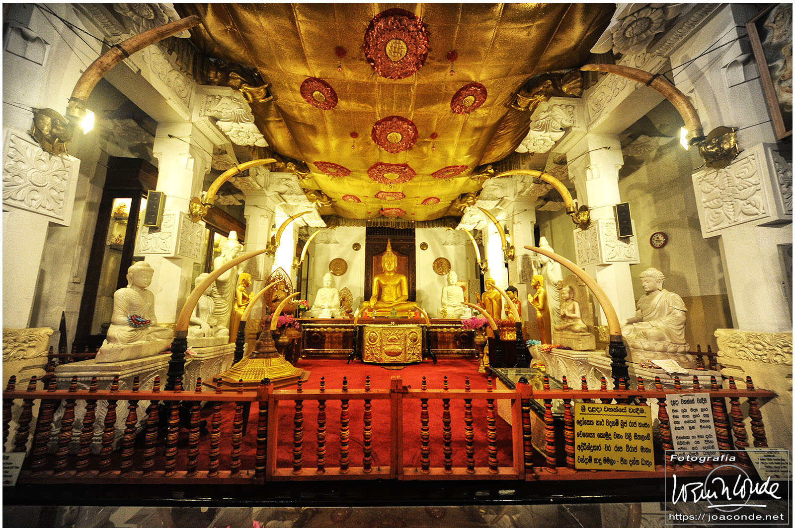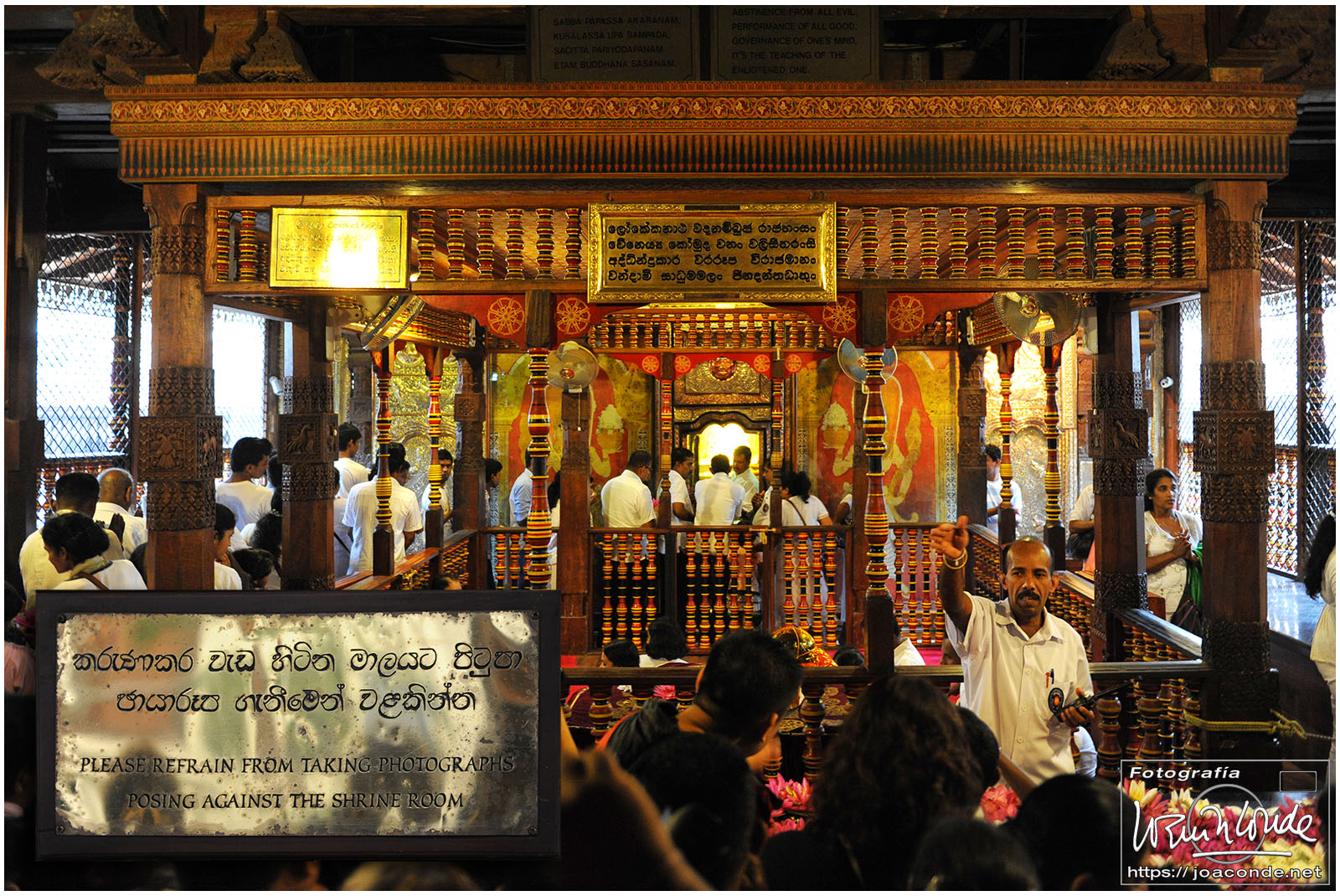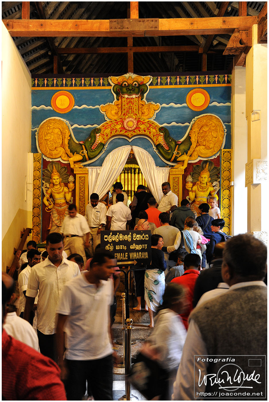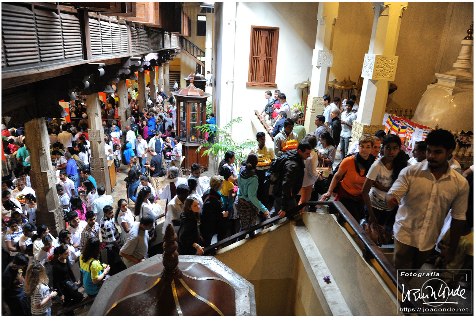 Un lugar que me impactó especialmente en Sri Lanka fue el Templo del Diente de Buda, Sri Dalada Maligawa, en la ciudad de Kandy. Cada día, desde muy temprano, acudían al templo miles de devotos para venerar la reliquia. La multitud se dirigía a la primera planta del templo, donde se guardaba el diente original, traído desde India en el s. IV a.d.C. Durante unos momentos inenarrables, la energía de la reliquia o los cientos de fieles que empujaban 😉, me levantaron los pies del suelo. No sé cómo pude pude hacer las fotos.