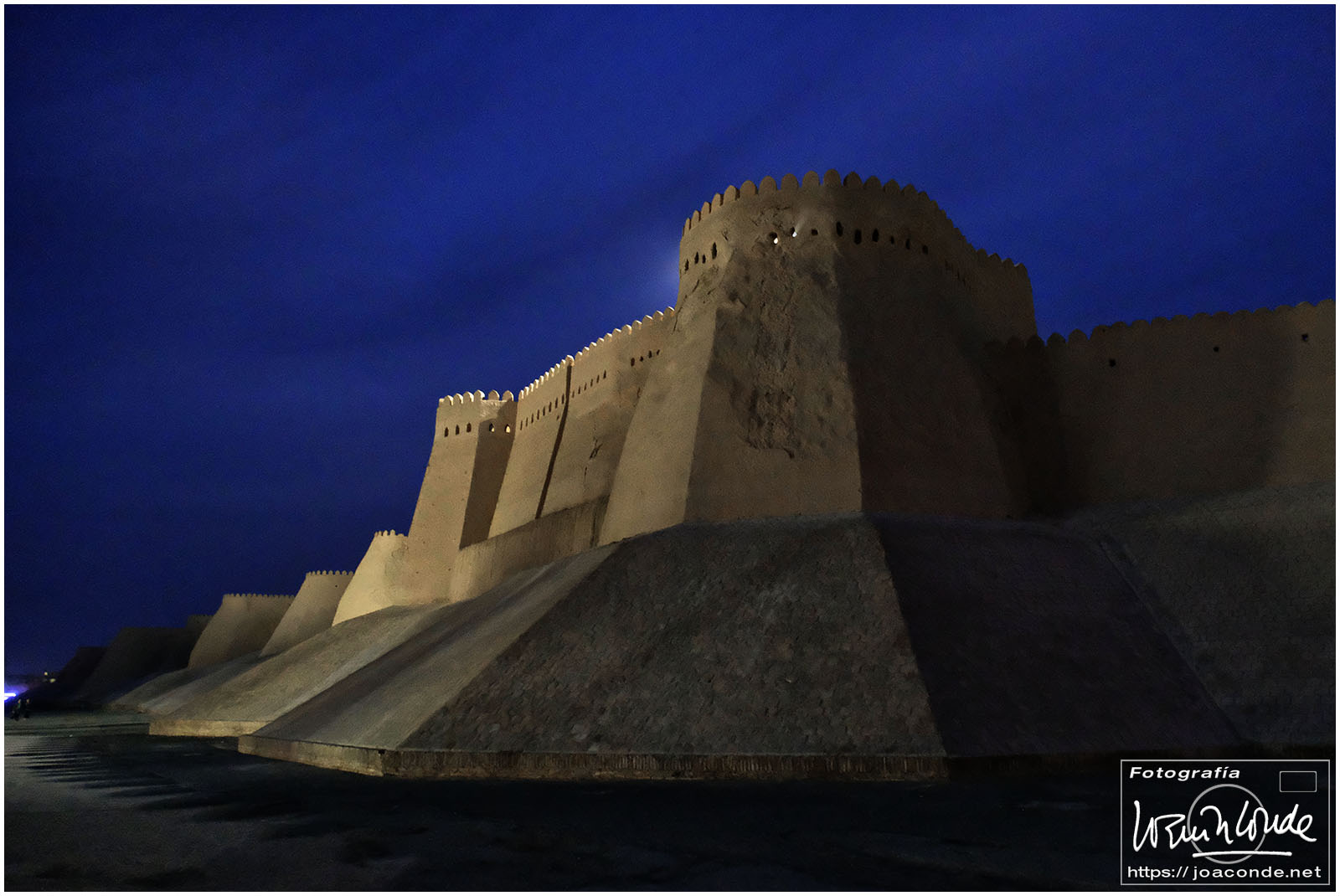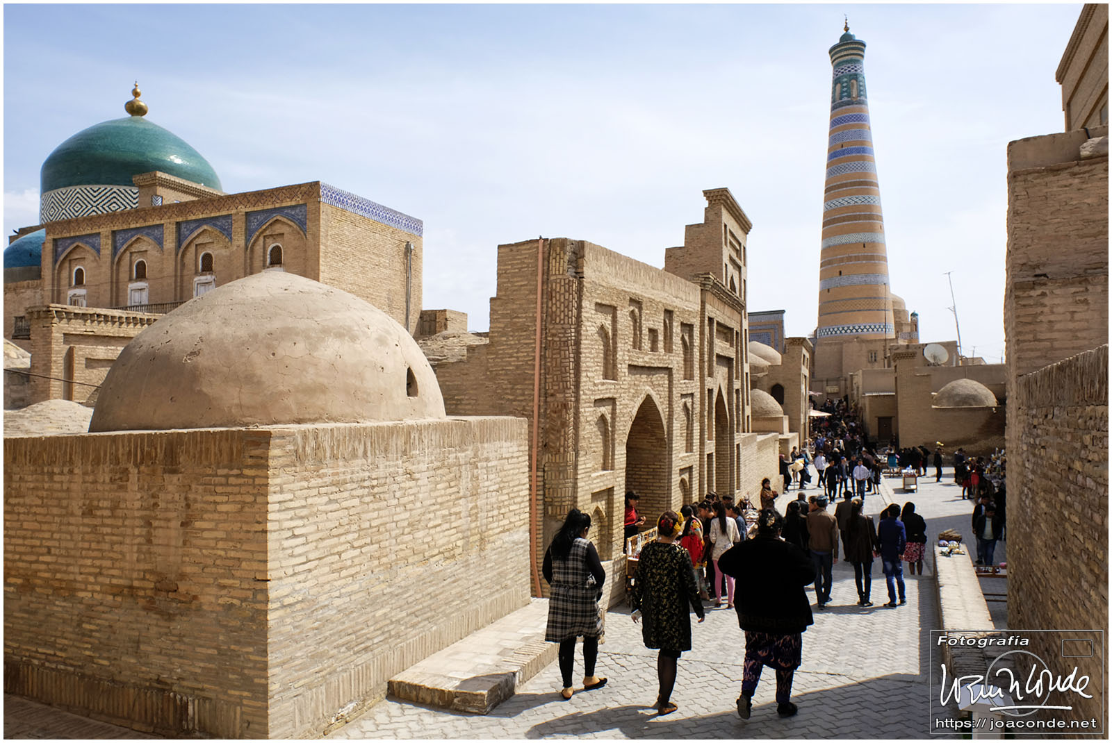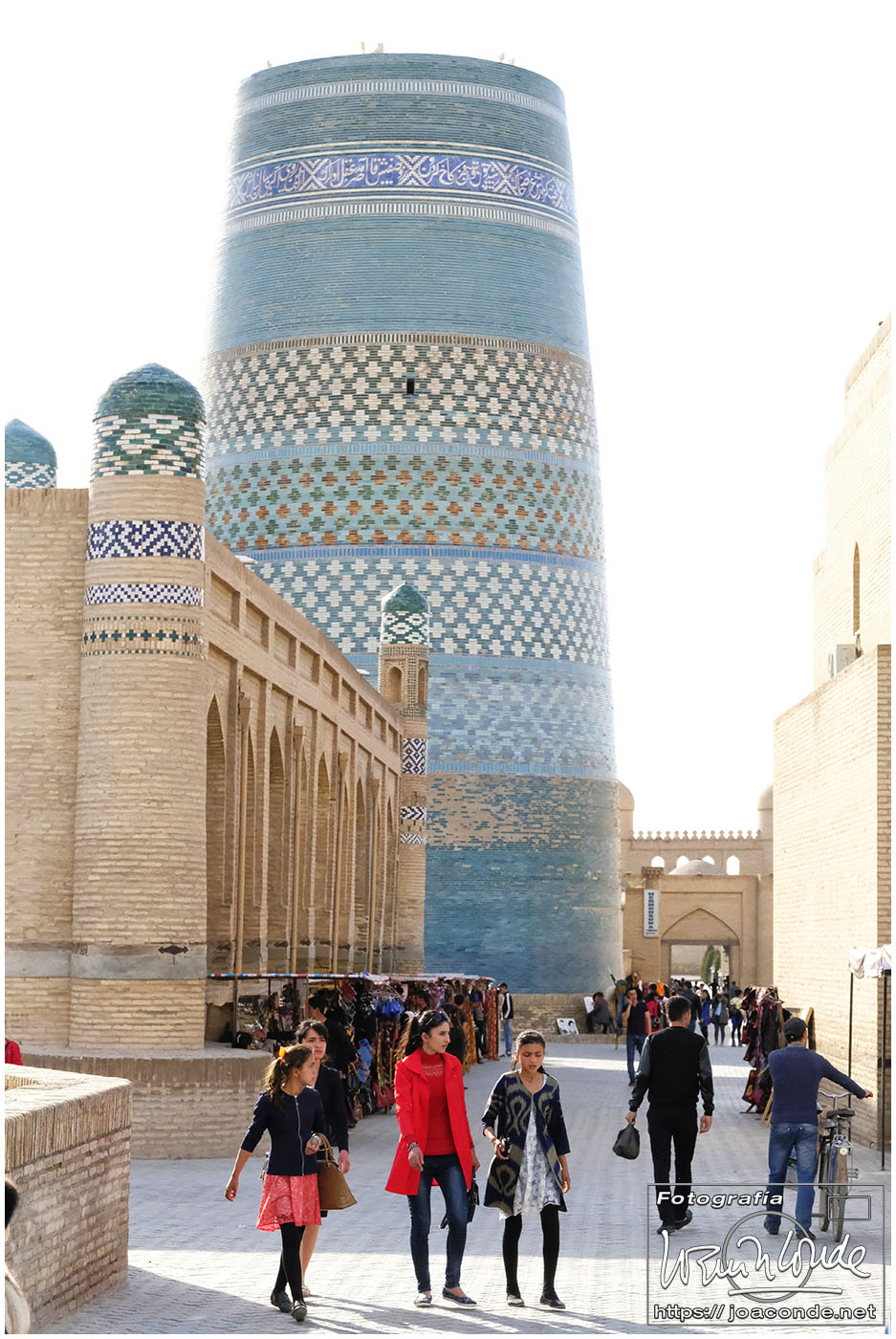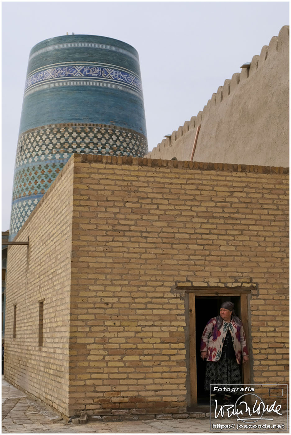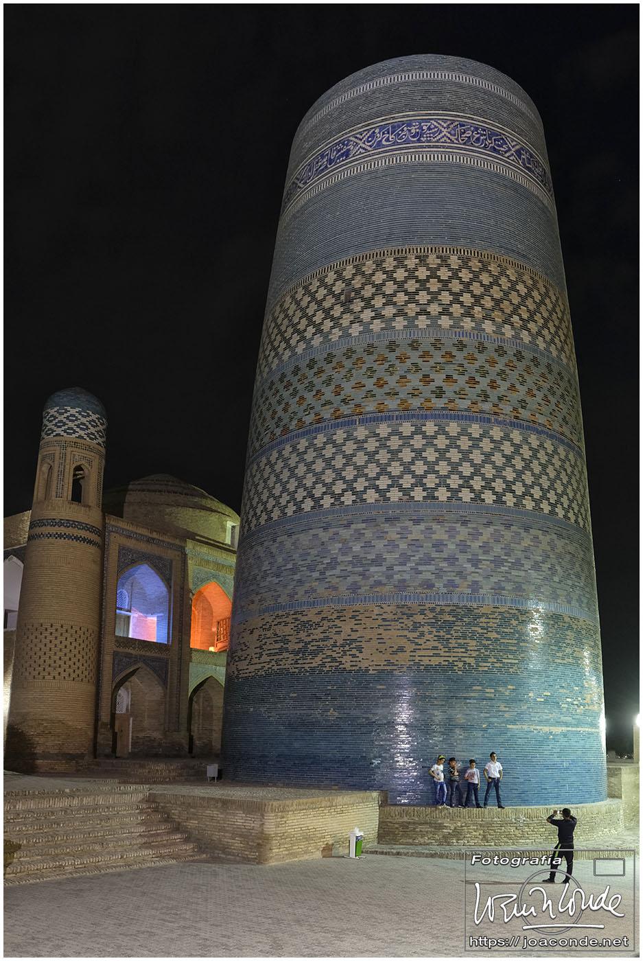 En el centro de Jiva, Itchan Kala era una ciudadela impresionante y muy bien conservada. Recorrimos el conjunto Kuñya-Ark (s. II A.C.), Tash Javli (palacio de piedras), Kalta Minor, la mezquita Djumá con 212 columnas de madera (ss. XI -XVIII), la madrasa de Shergazi-khan, el mausoleo Sagrado Pakhlavon-Makhmud (ss. XII y XIII), la madrasa de Alloquli Khan, el conjunto de Islam Khodja… Era un día de bodas, de visitas escolares… Por la noche, cuando se marcharon los turistas, volvimos a la ciudadela iluminada.