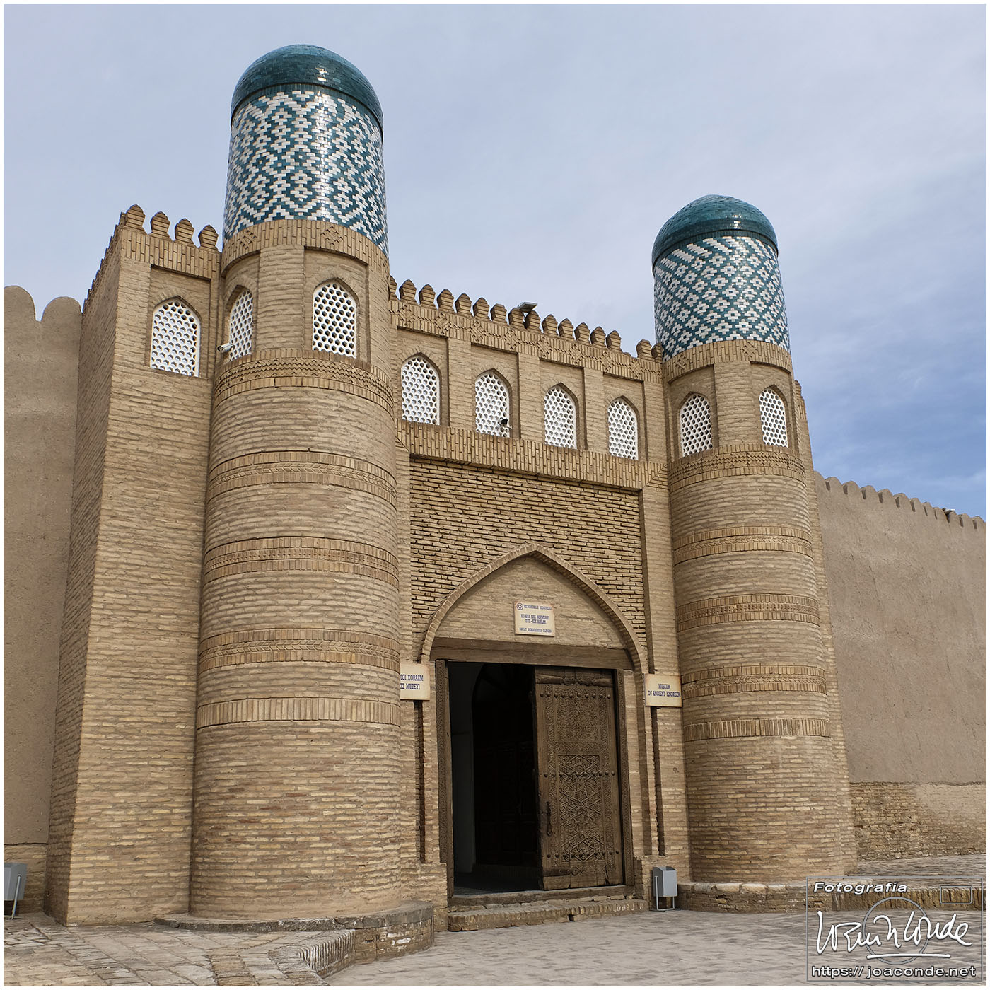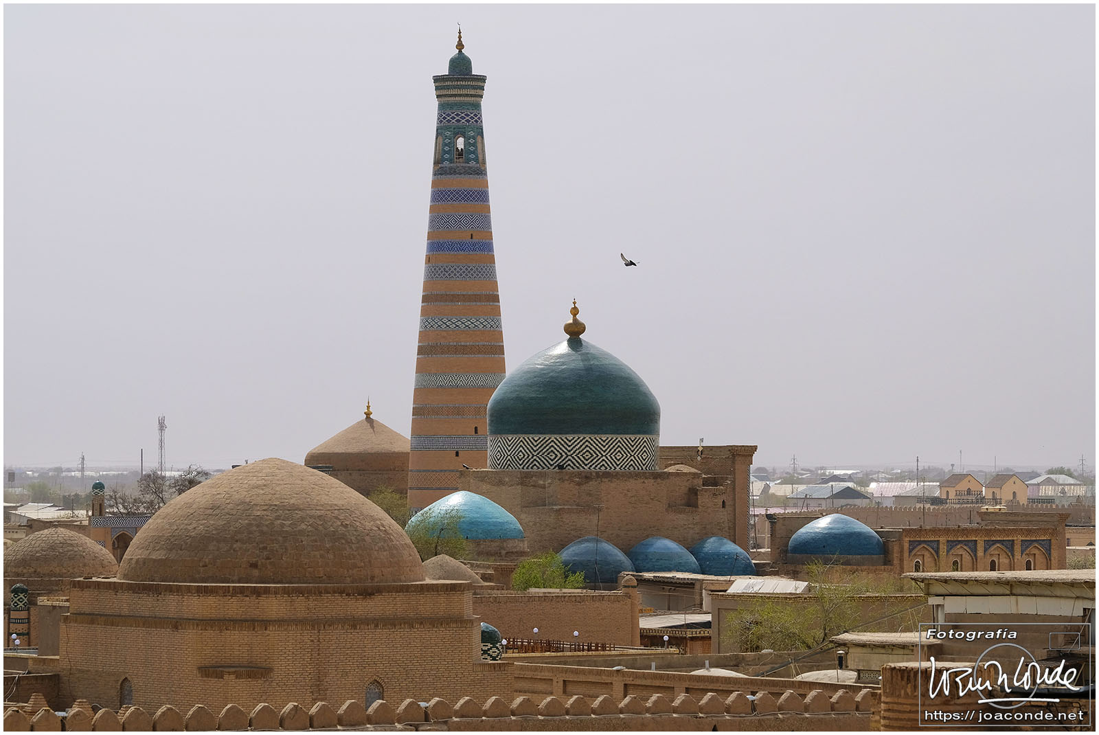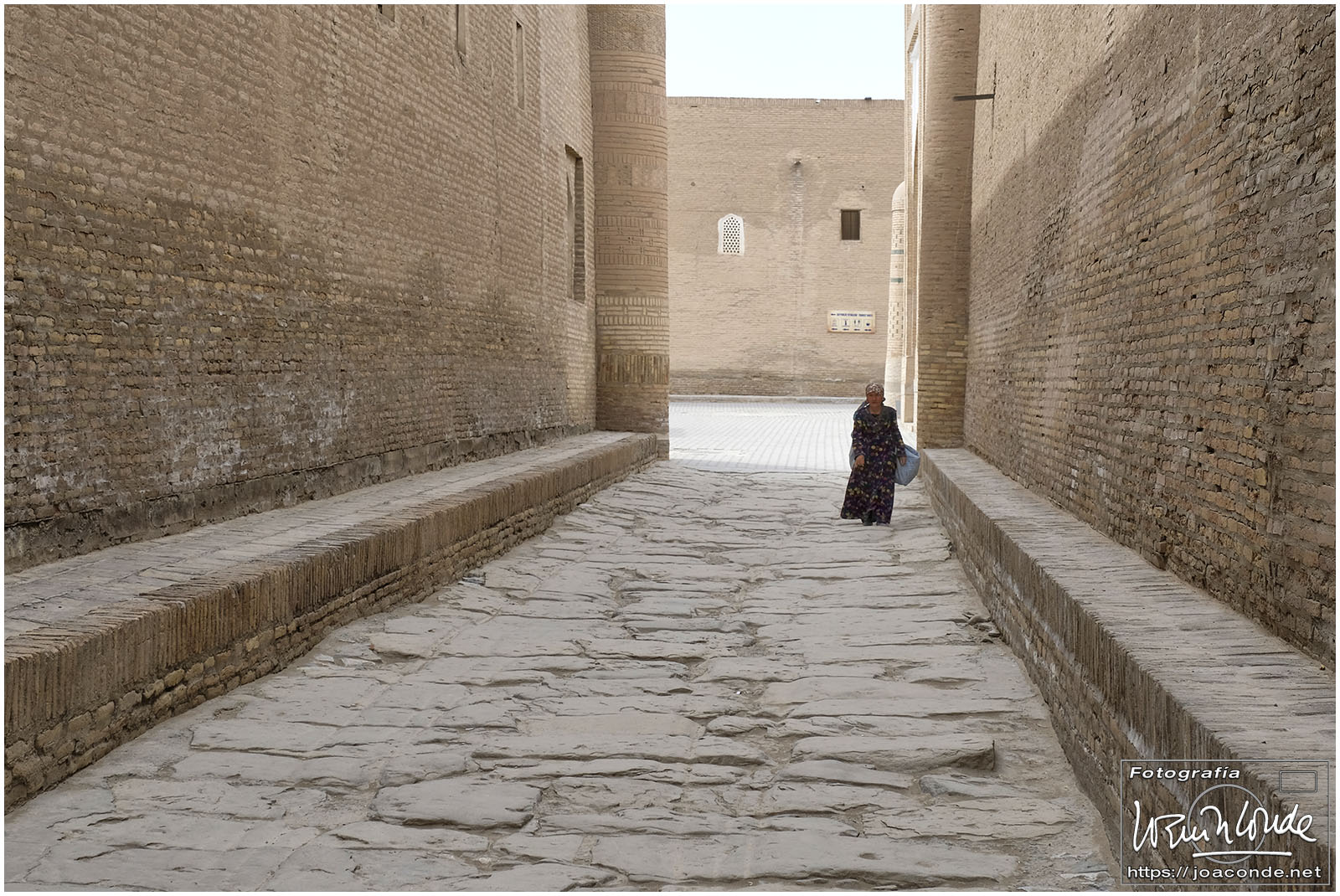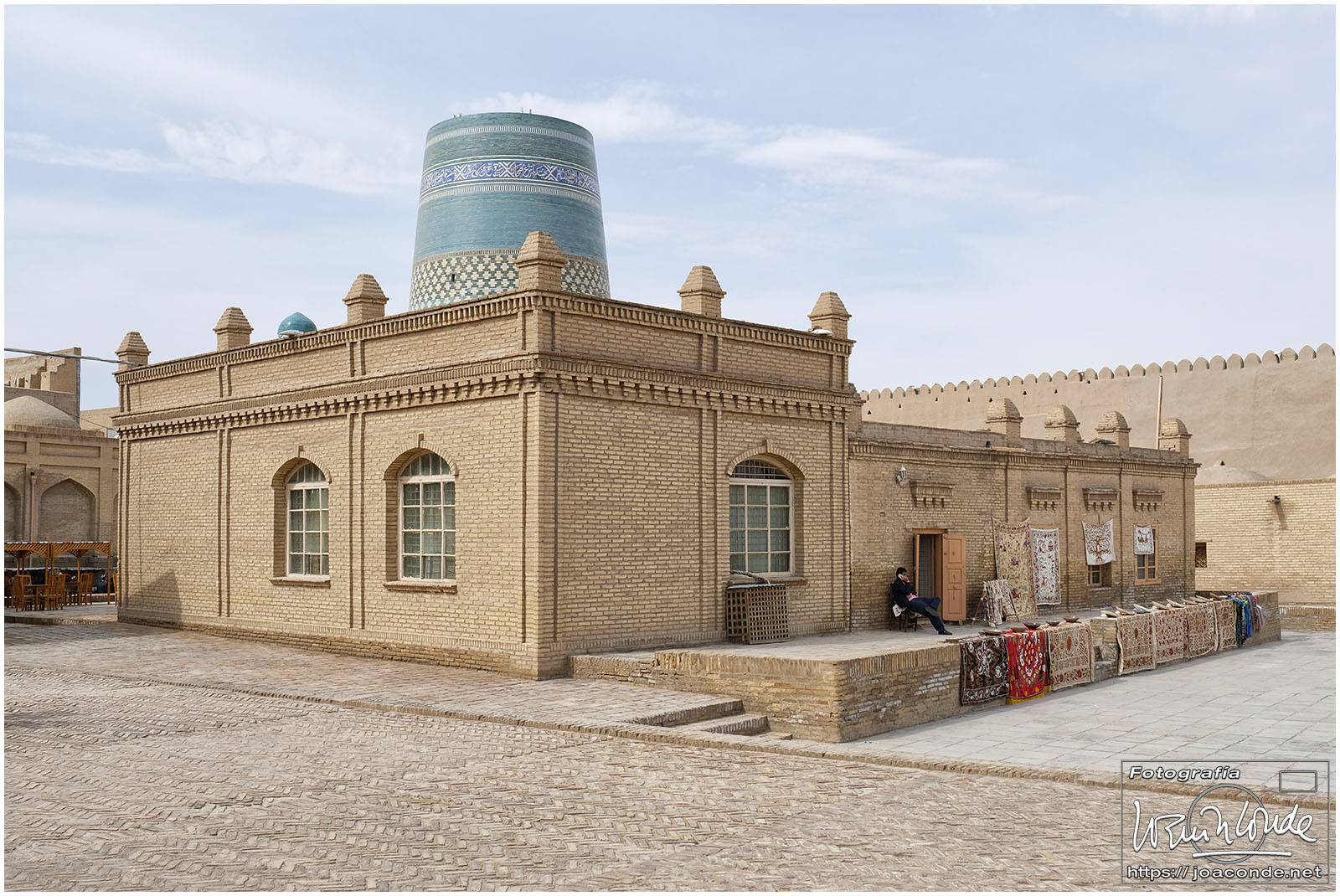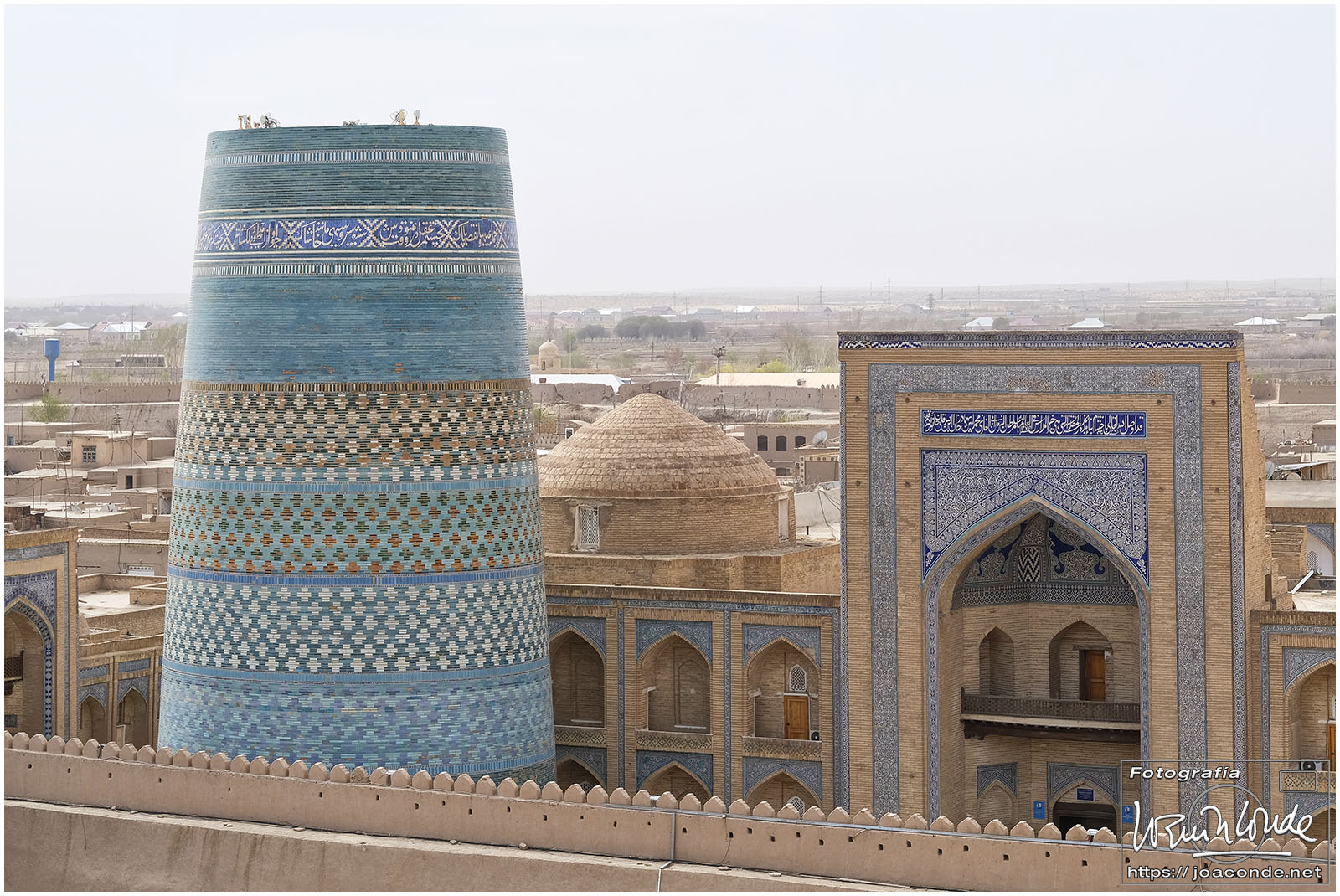 En el centro de Jiva, Itchan Kala era una ciudadela impresionante y muy bien conservada. Recorrimos el conjunto Kuñya-Ark (s. II A.C.), Tash Javli (palacio de piedras), Kalta Minor, la mezquita Djumá con 212 columnas de madera (ss. XI -XVIII), la madrasa de Shergazi-khan, el mausoleo Sagrado Pakhlavon-Makhmud (ss. XII y XIII), la madrasa de Alloquli Khan, el conjunto de Islam Khodja… Era un día de bodas, de visitas escolares… Por la noche, cuando se marcharon los turistas, volvimos a la ciudadela iluminada.