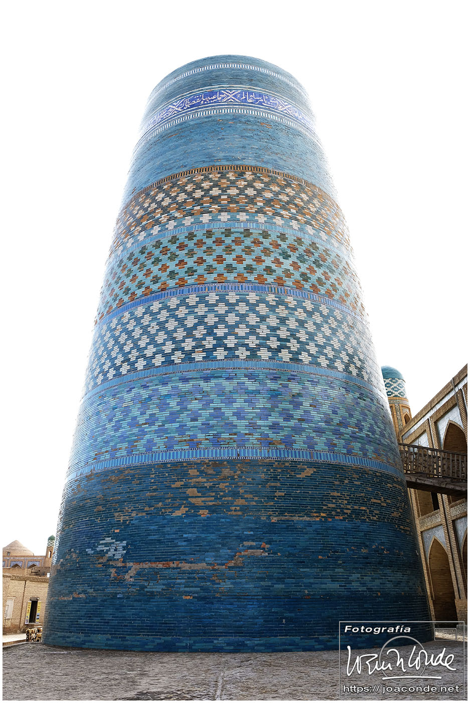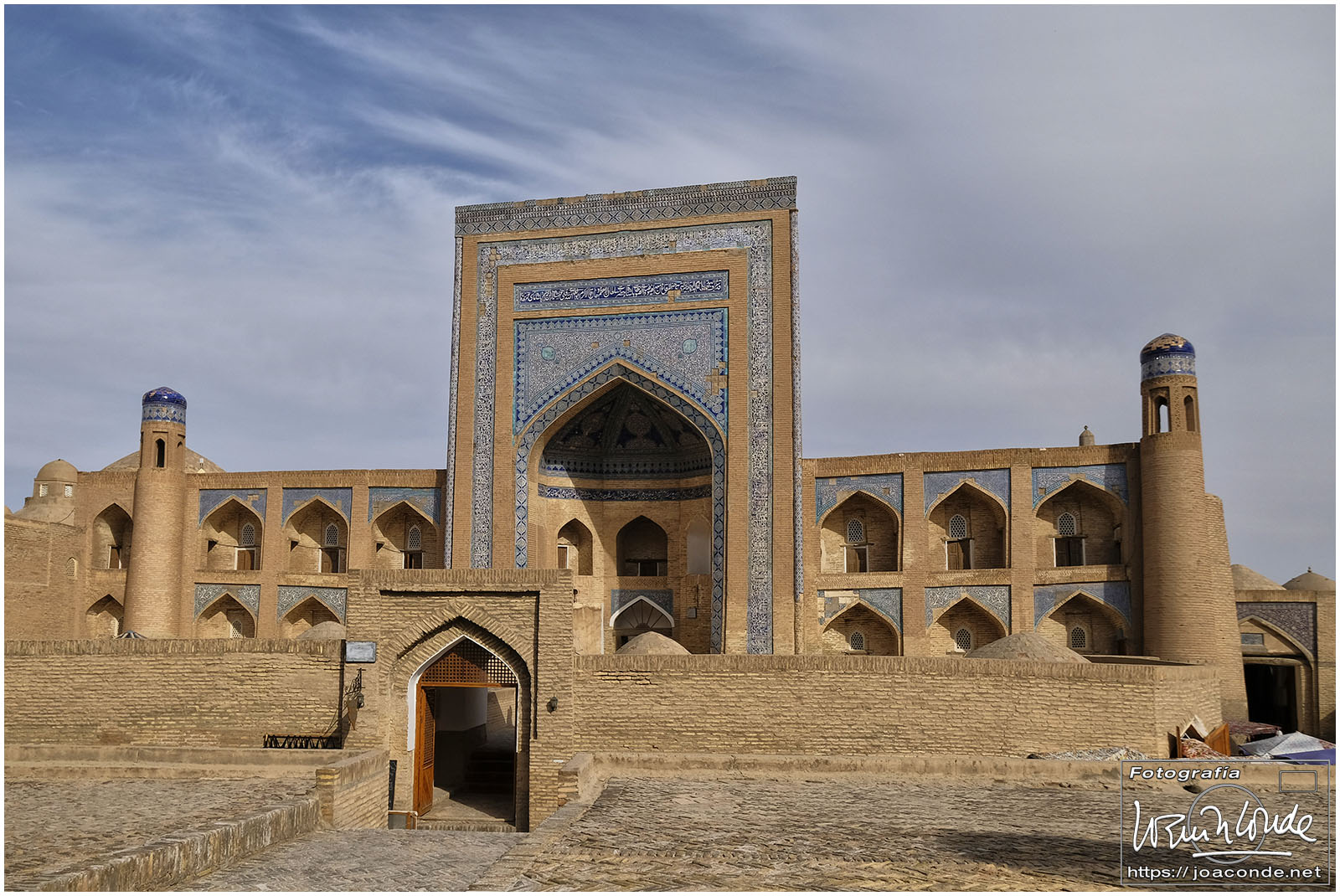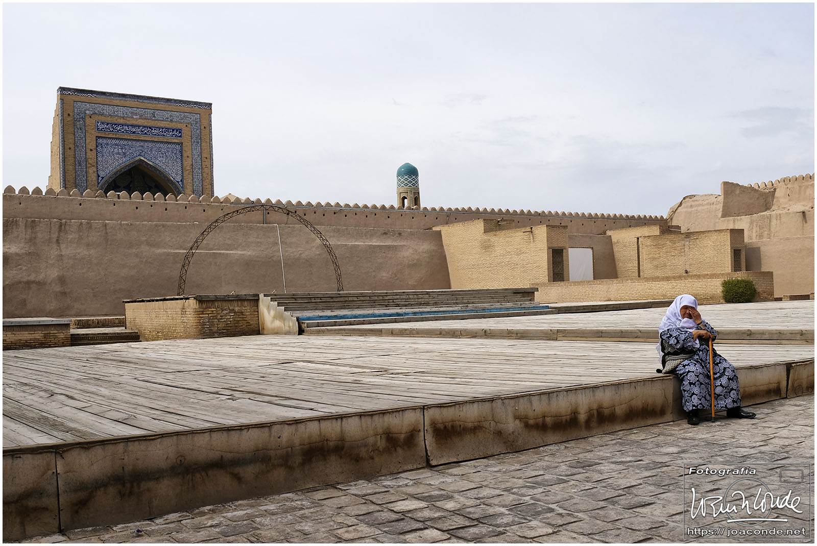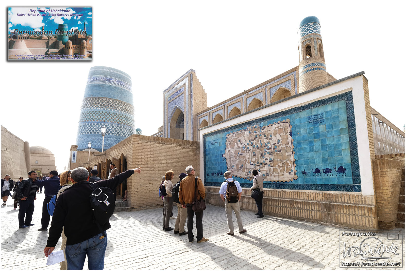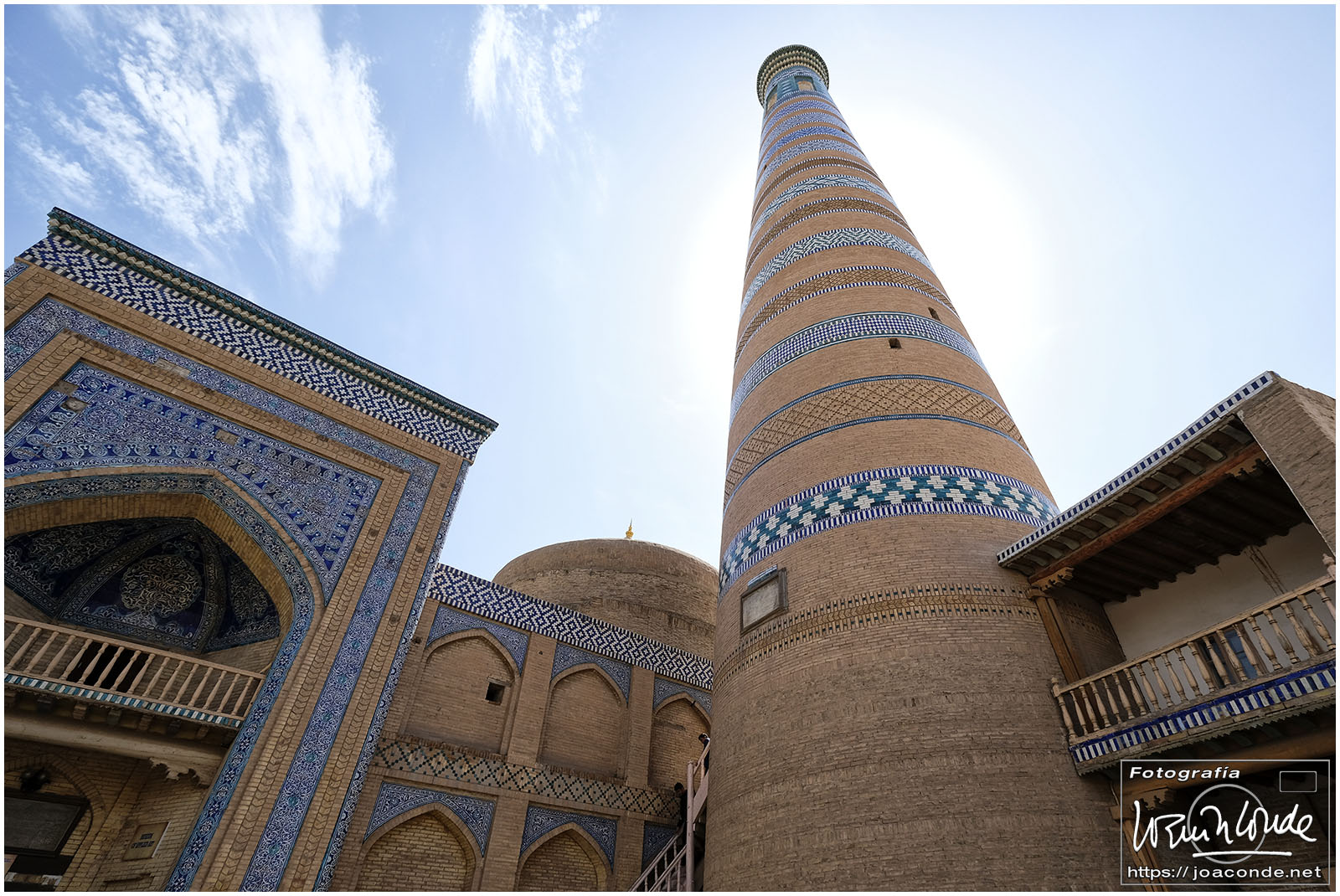 En el centro de Jiva, Itchan Kala era una ciudadela impresionante y muy bien conservada. Recorrimos el conjunto Kuñya-Ark (s. II A.C.), Tash Javli (palacio de piedras), Kalta Minor, la mezquita Djumá con 212 columnas de madera (ss. XI -XVIII), la madrasa de Shergazi-khan, el mausoleo Sagrado Pakhlavon-Makhmud (ss. XII y XIII), la madrasa de Alloquli Khan, el conjunto de Islam Khodja… Era un día de bodas, de visitas escolares… Por la noche, cuando se marcharon los turistas, volvimos a la ciudadela iluminada.