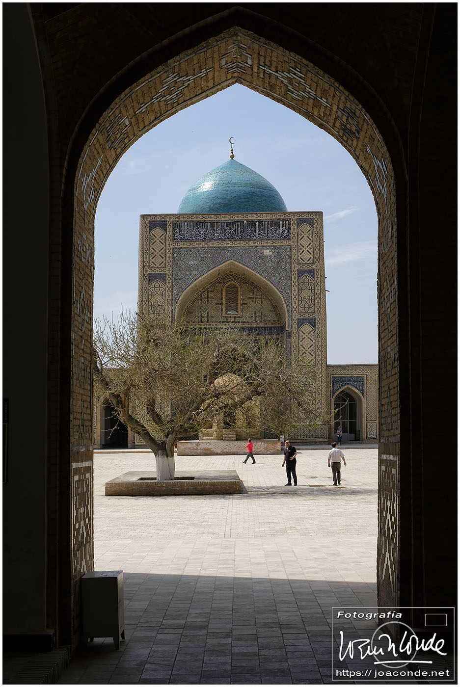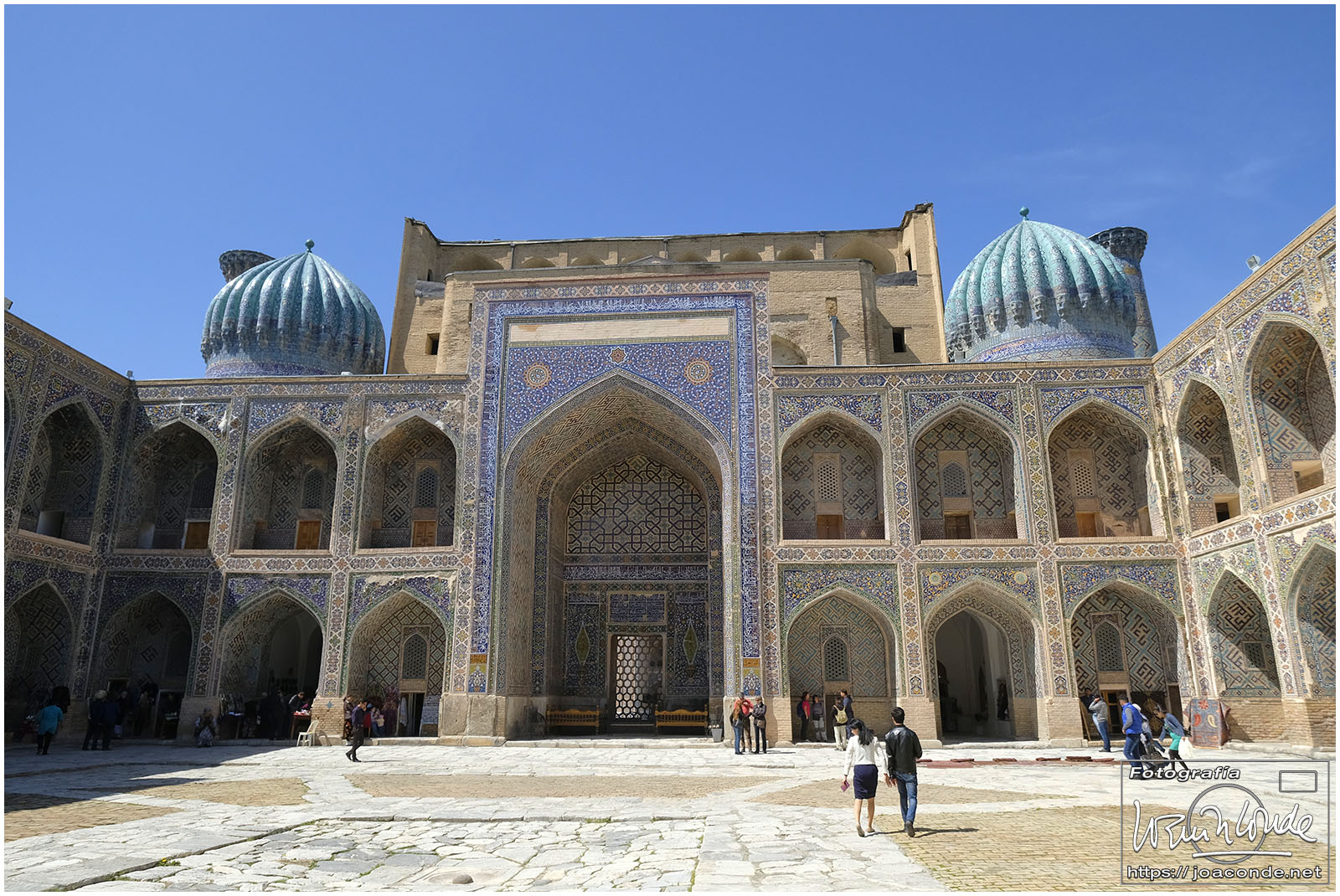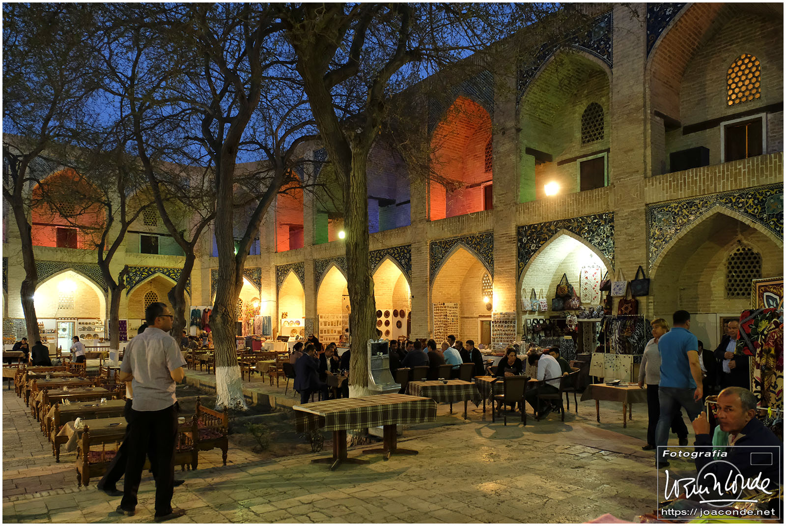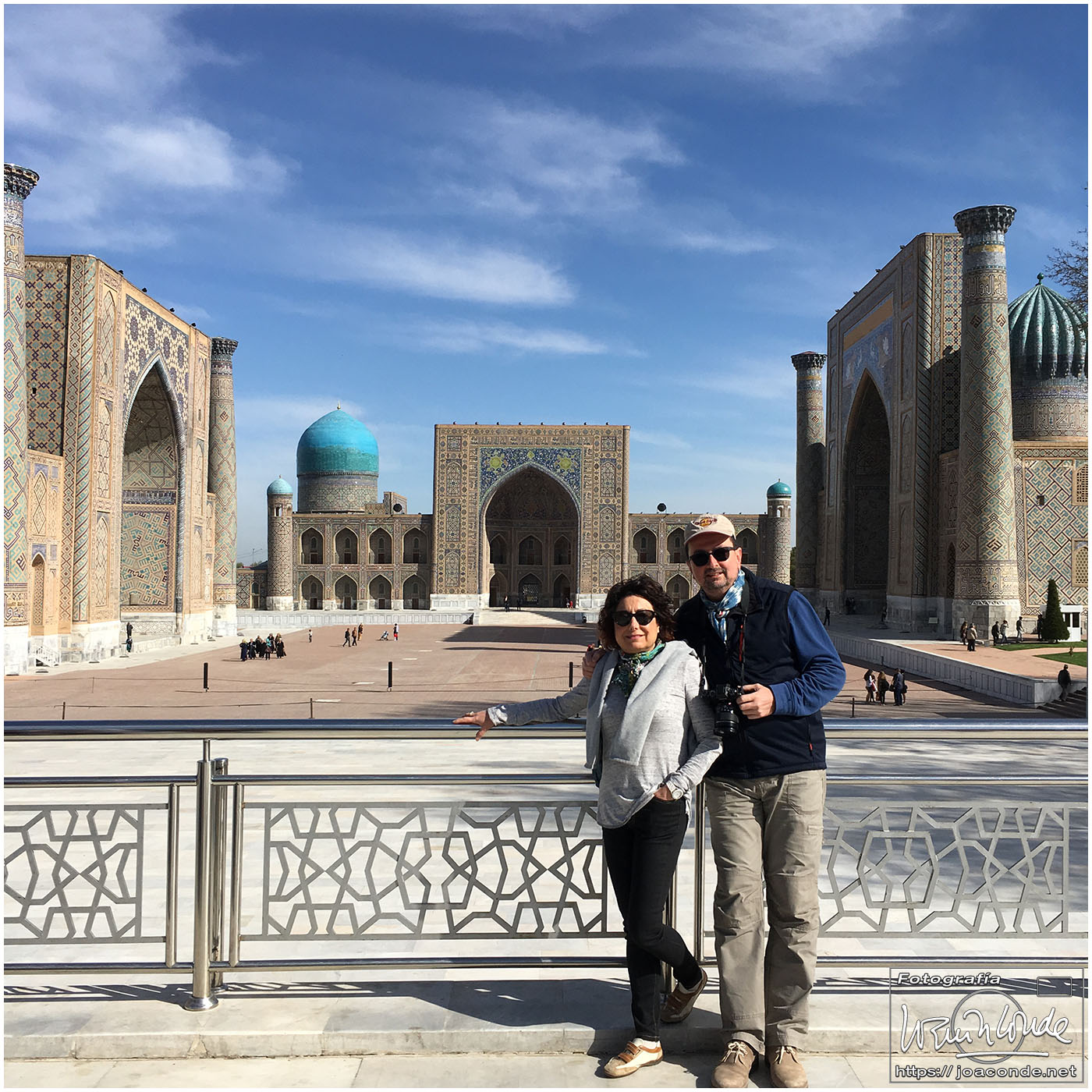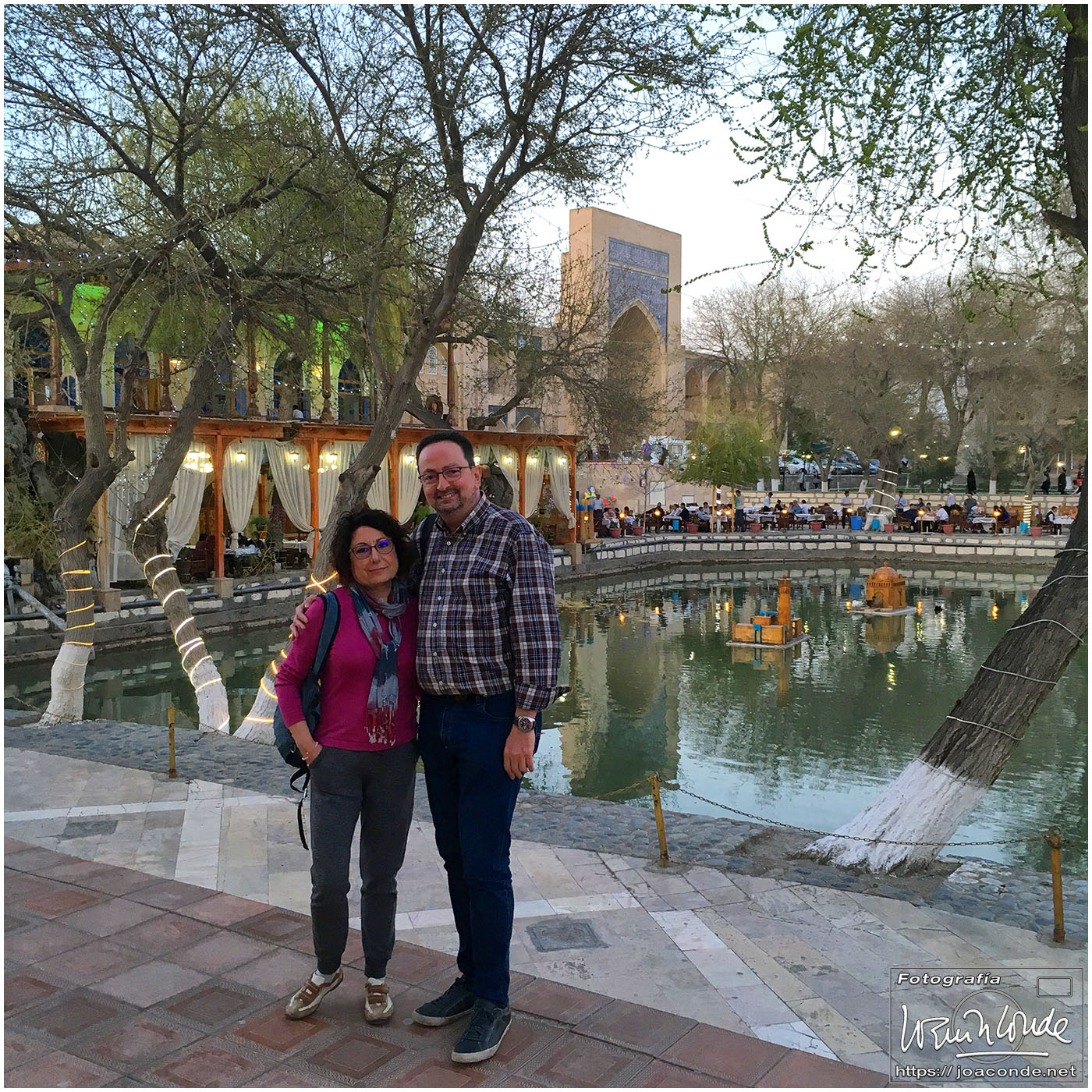 Nosotros empezamos el viernes visitando la Plaza Registán, sin duda una de las más hermosas del mundo, con las madrasas de Ulugbek, Sher–Dor y Tillaqori, la Mezquita Bibi Khanum, y el Mercado Siyob. Comimos en el Karimbek, un restaurante de culto. Por la tarde nos acercamos al Mausoleo de Amir Temur (junto a la calle Rui Gonsales de Klavixo) y volvimos a la Plaza Registán para ver el ocaso, que por lo nublado no fue nada brillante.