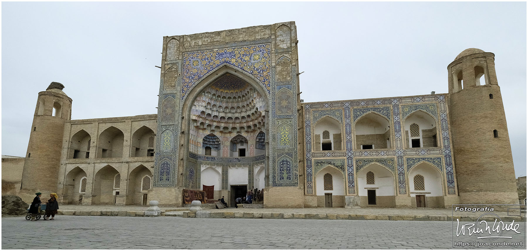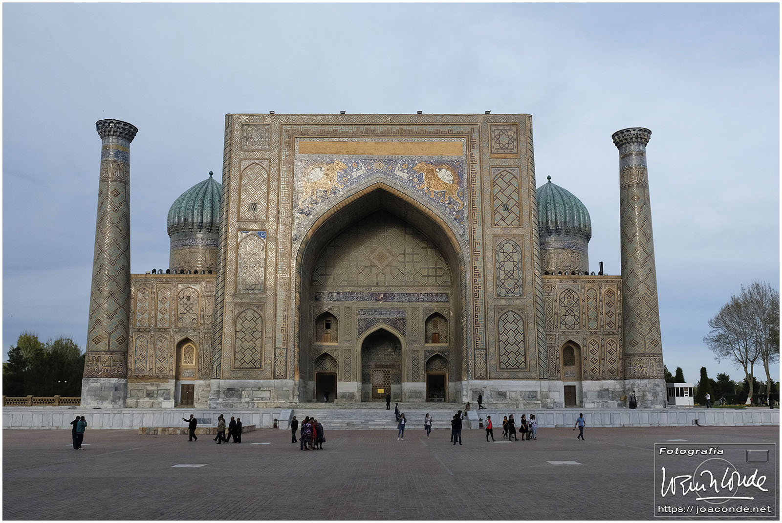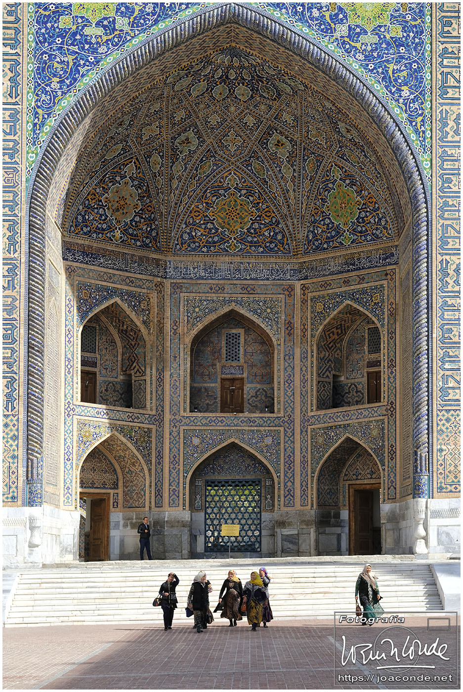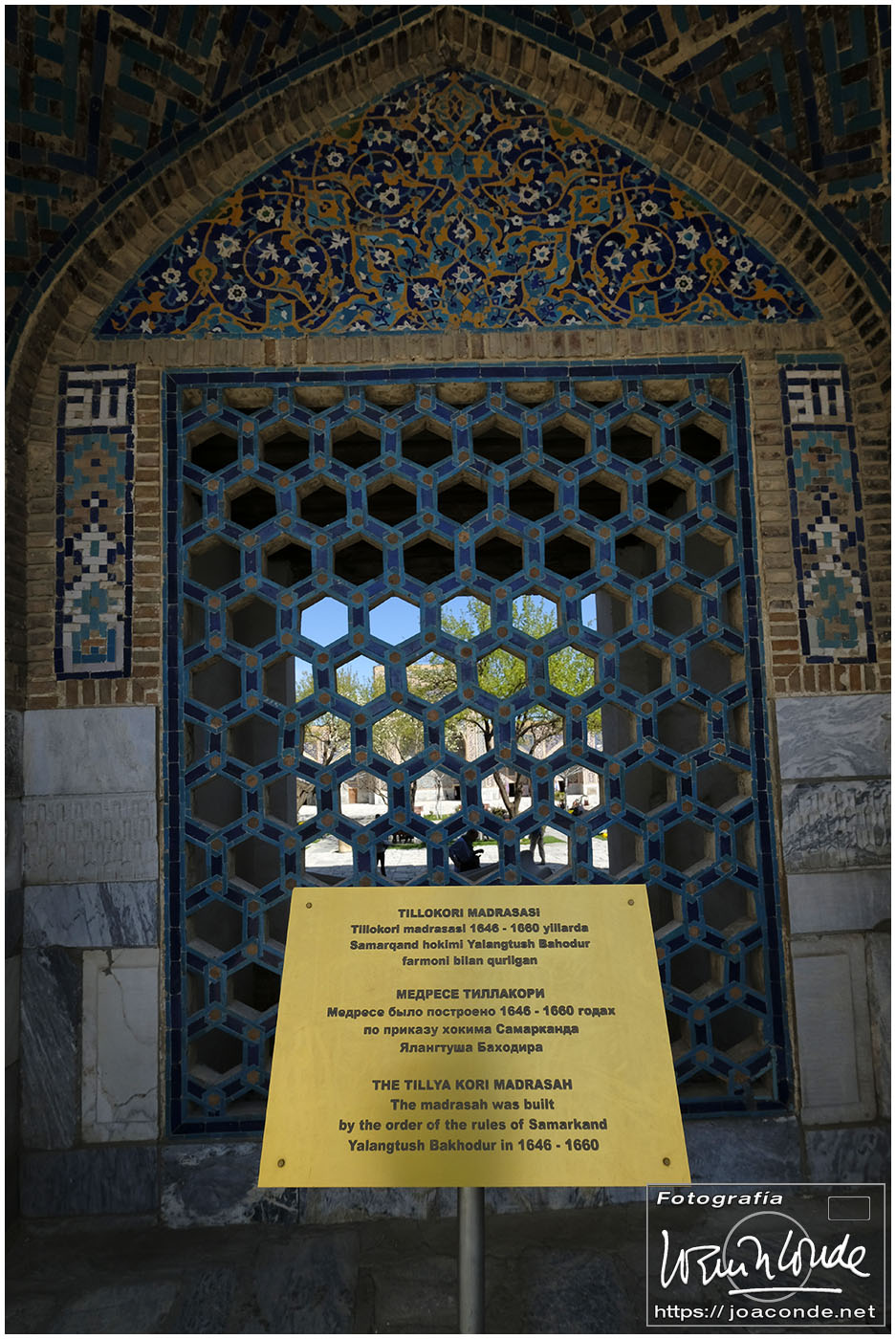 Nosotros empezamos el viernes visitando la Plaza Registán, sin duda una de las más hermosas del mundo, con las madrasas de Ulugbek, Sher–Dor y Tillaqori, la Mezquita Bibi Khanum, y el Mercado Siyob. Comimos en el Karimbek, un restaurante de culto. Por la tarde nos acercamos al Mausoleo de Amir Temur (junto a la calle Rui Gonsales de Klavixo) y volvimos a la Plaza Registán para ver el ocaso, que por lo nublado no fue nada brillante.