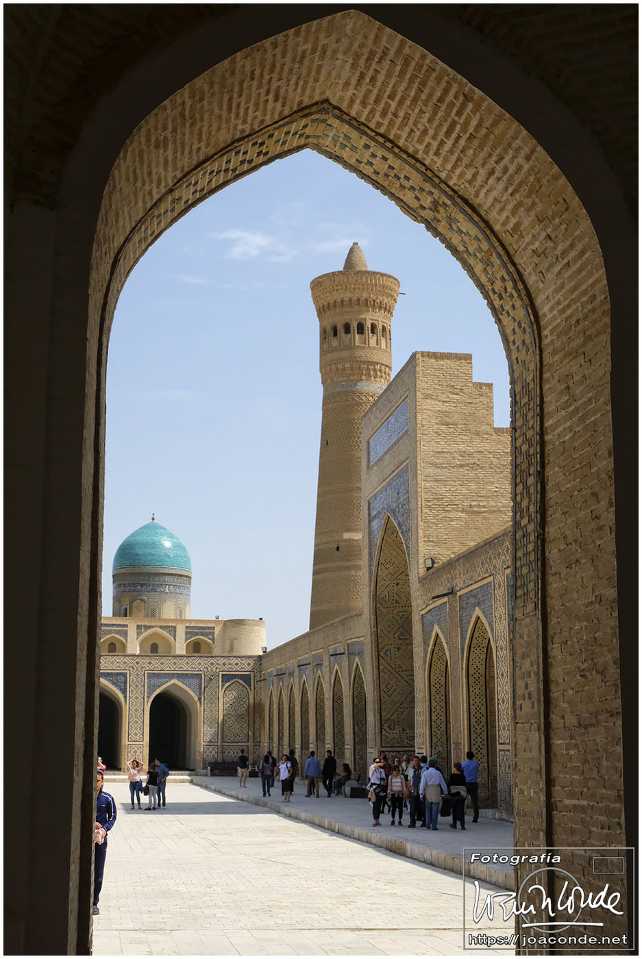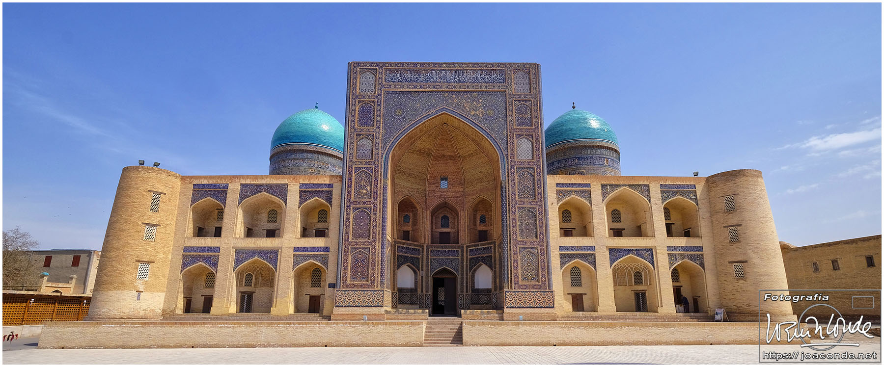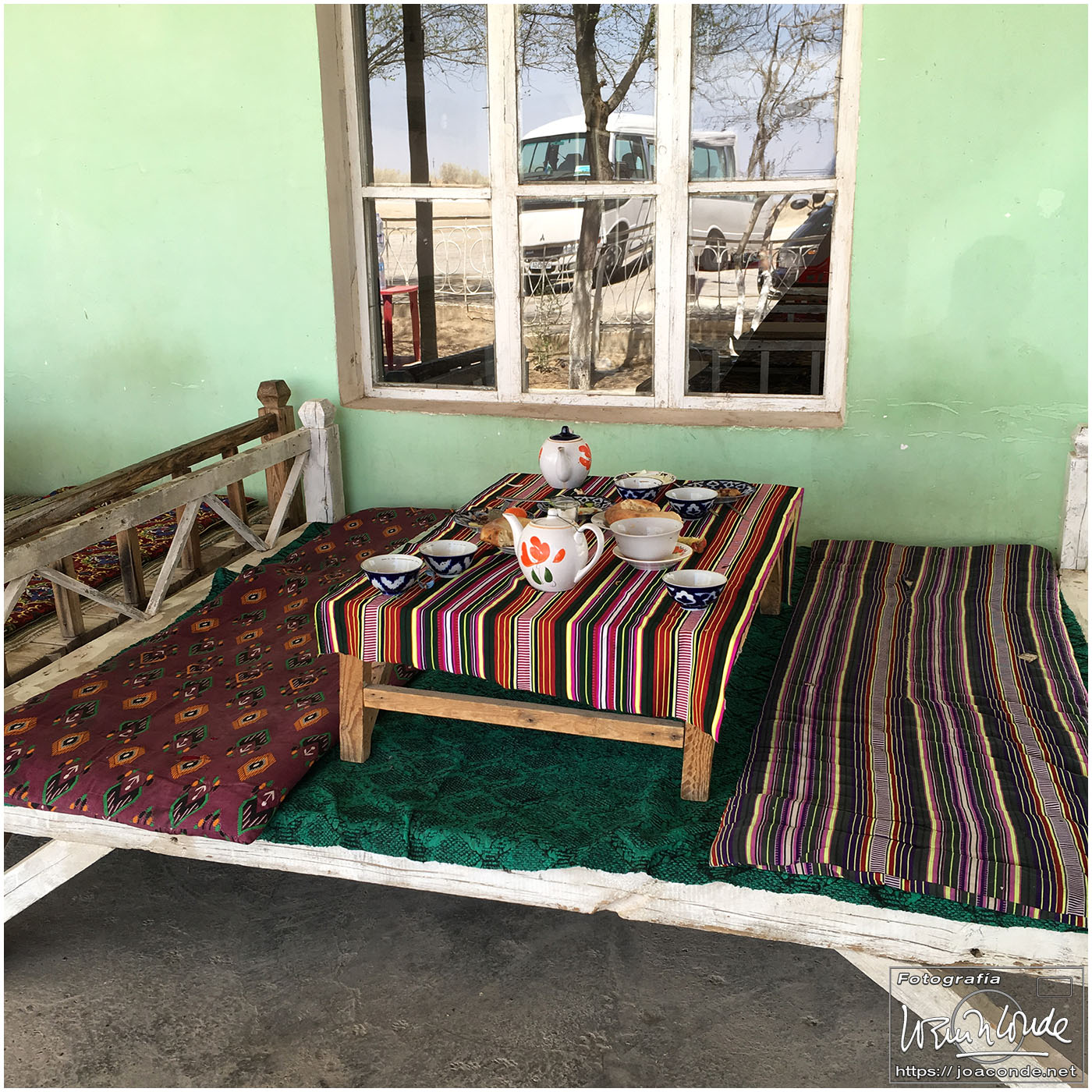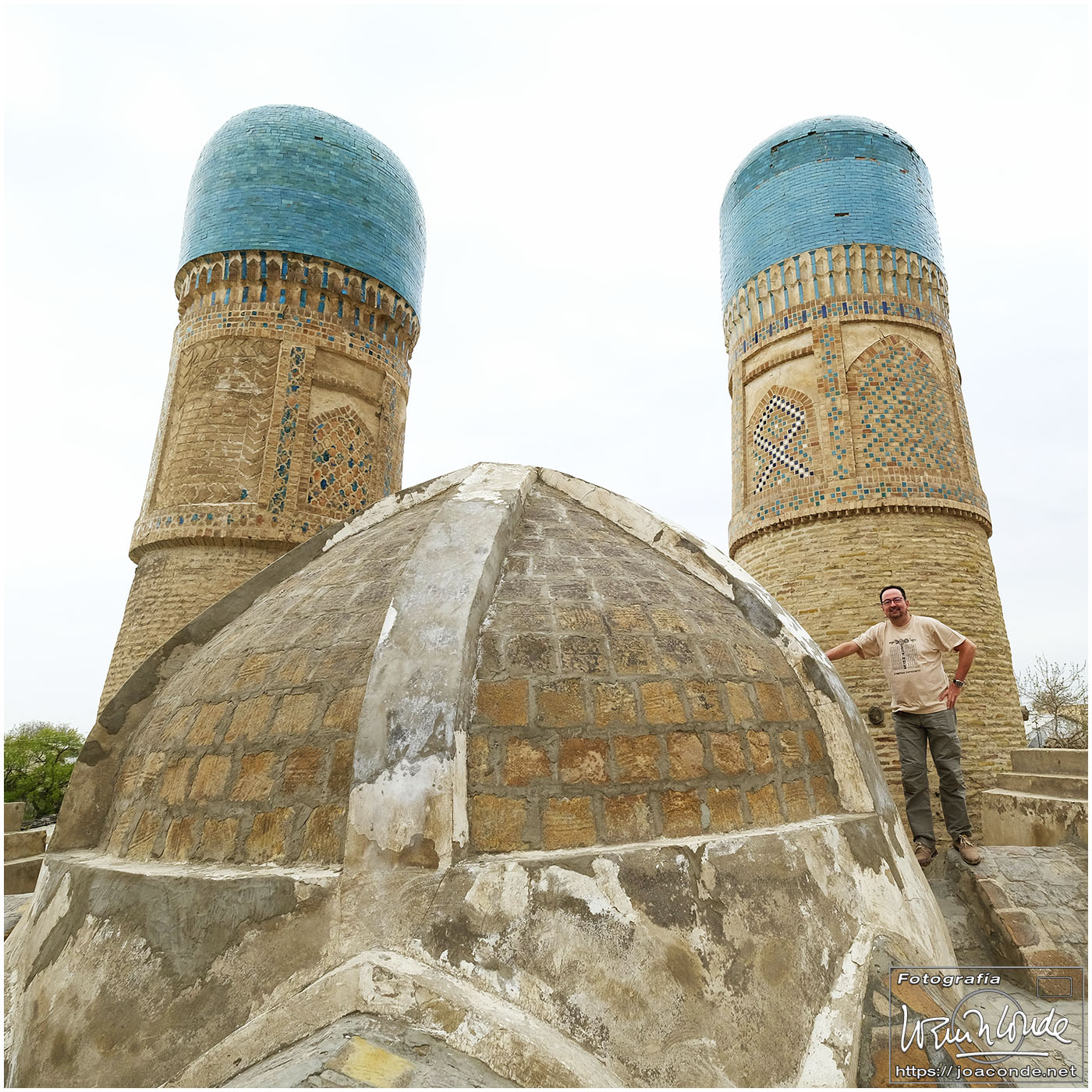 De Jiva a Bujará había unos 400 km, más de seis horas en coche por el desierto. De vez en cuando algún pastor, pero nada más. Paramos a desaguar —en medio de aquella nada— y yo me adentré en aquel arenal… De pronto se me acercó un hombre armado y me hizo señales de que me fuera para atrás. Sadir me dijo después que había hecho pis en la misma frontera de Turkmenistán 😯. Afortunadamente, todo quedó en unas risas😂. Comimos en un bar de carretera; las mesas eran algo incómodas pero tuvieron el detalle de ponernos una de las nuestras. Por la tarde llegamos a Bujará.