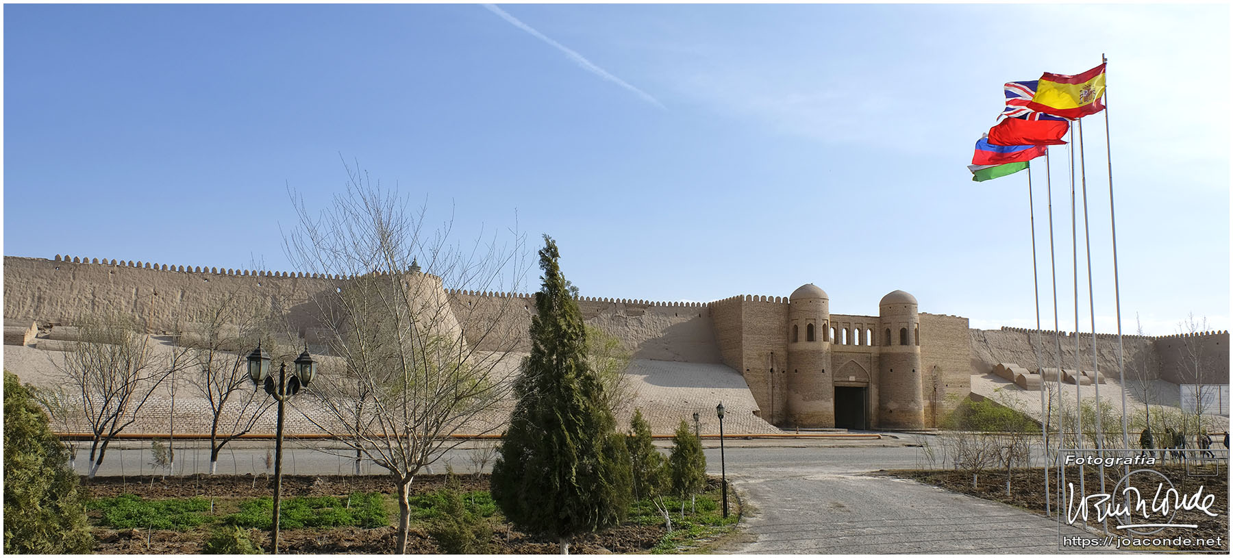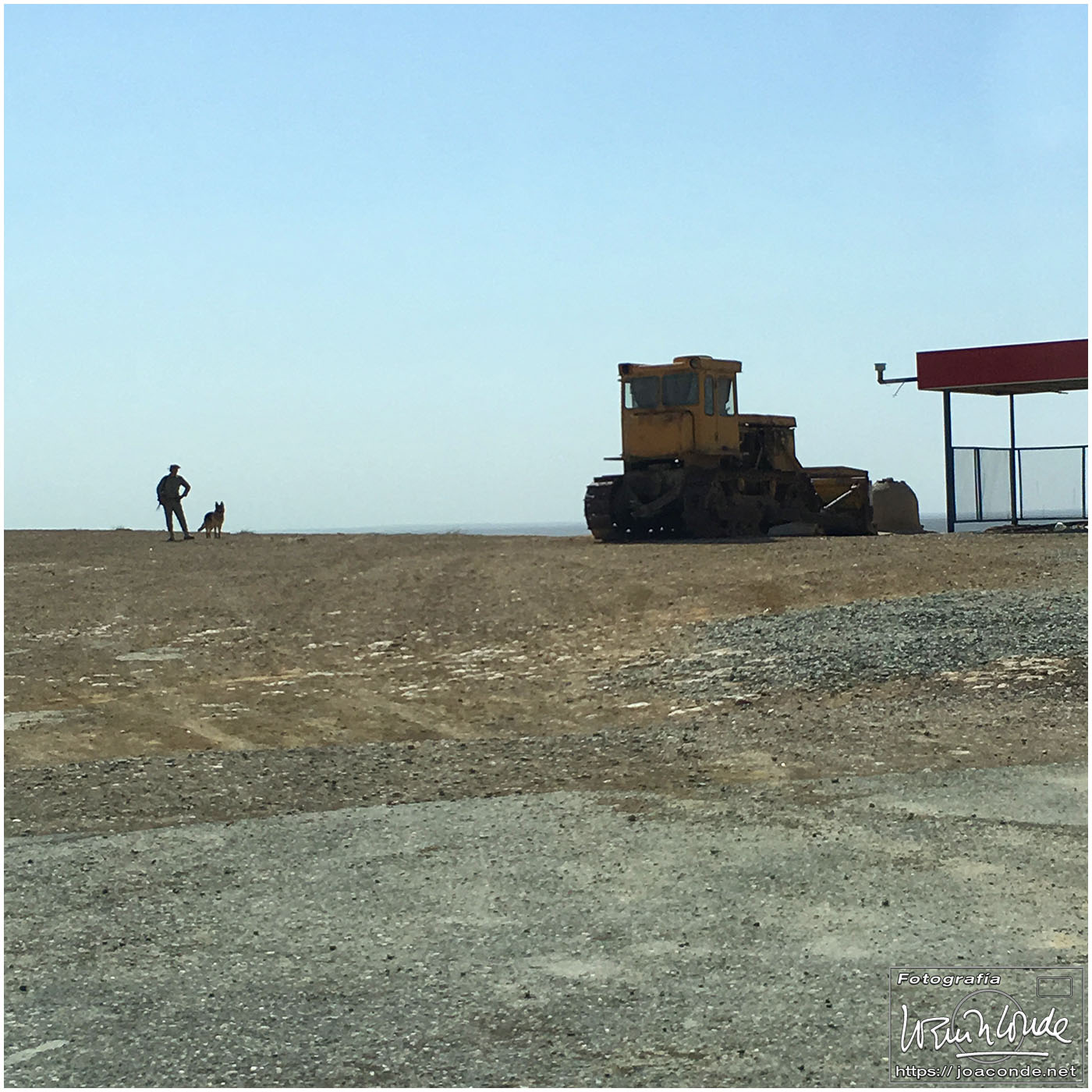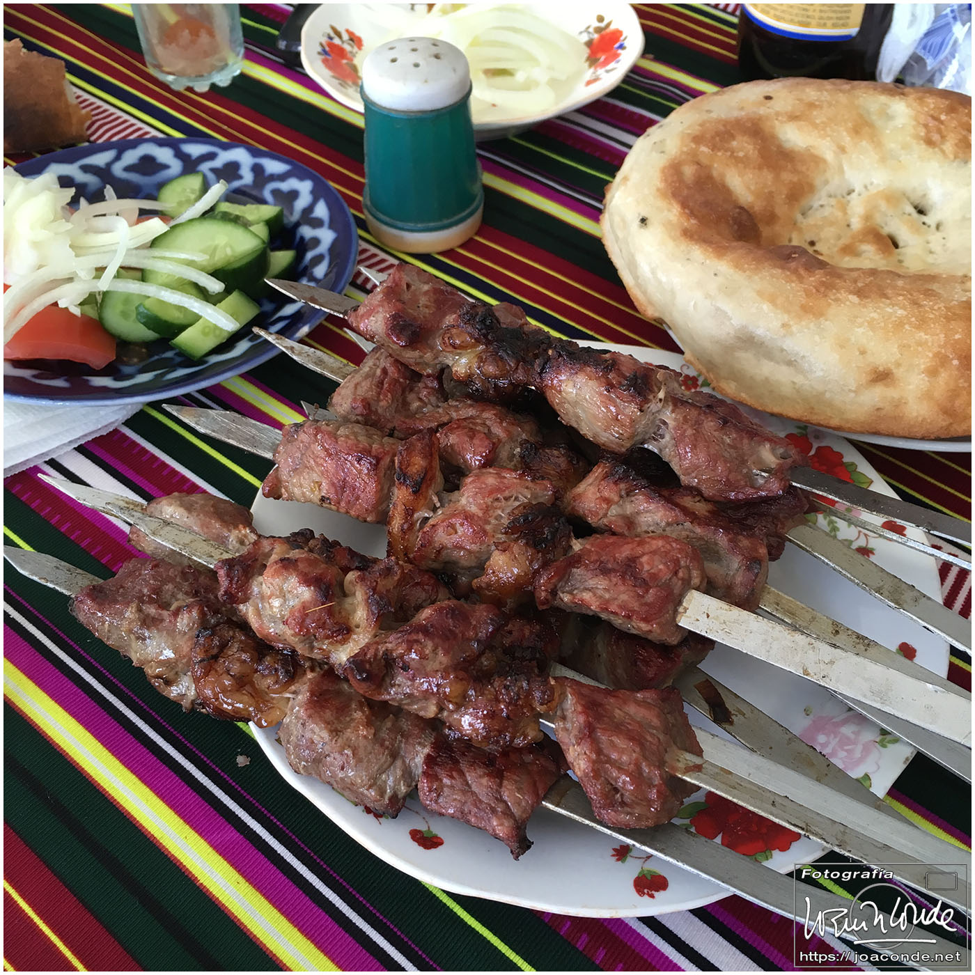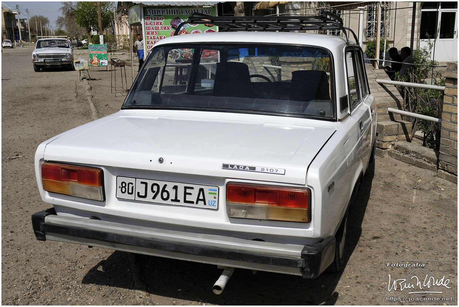 De Jiva a Bujará había unos 400 km, más de seis horas en coche por el desierto. De vez en cuando algún pastor, pero nada más. Paramos a desaguar —en medio de aquella nada— y yo me adentré en aquel arenal… De pronto se me acercó un hombre armado y me hizo señales de que me fuera para atrás. Sadir me dijo después que había hecho pis en la misma frontera de Turkmenistán 😯. Afortunadamente, todo quedó en unas risas😂. Comimos en un bar de carretera; las mesas eran algo incómodas pero tuvieron el detalle de ponernos una de las nuestras. Por la tarde llegamos a Bujará.