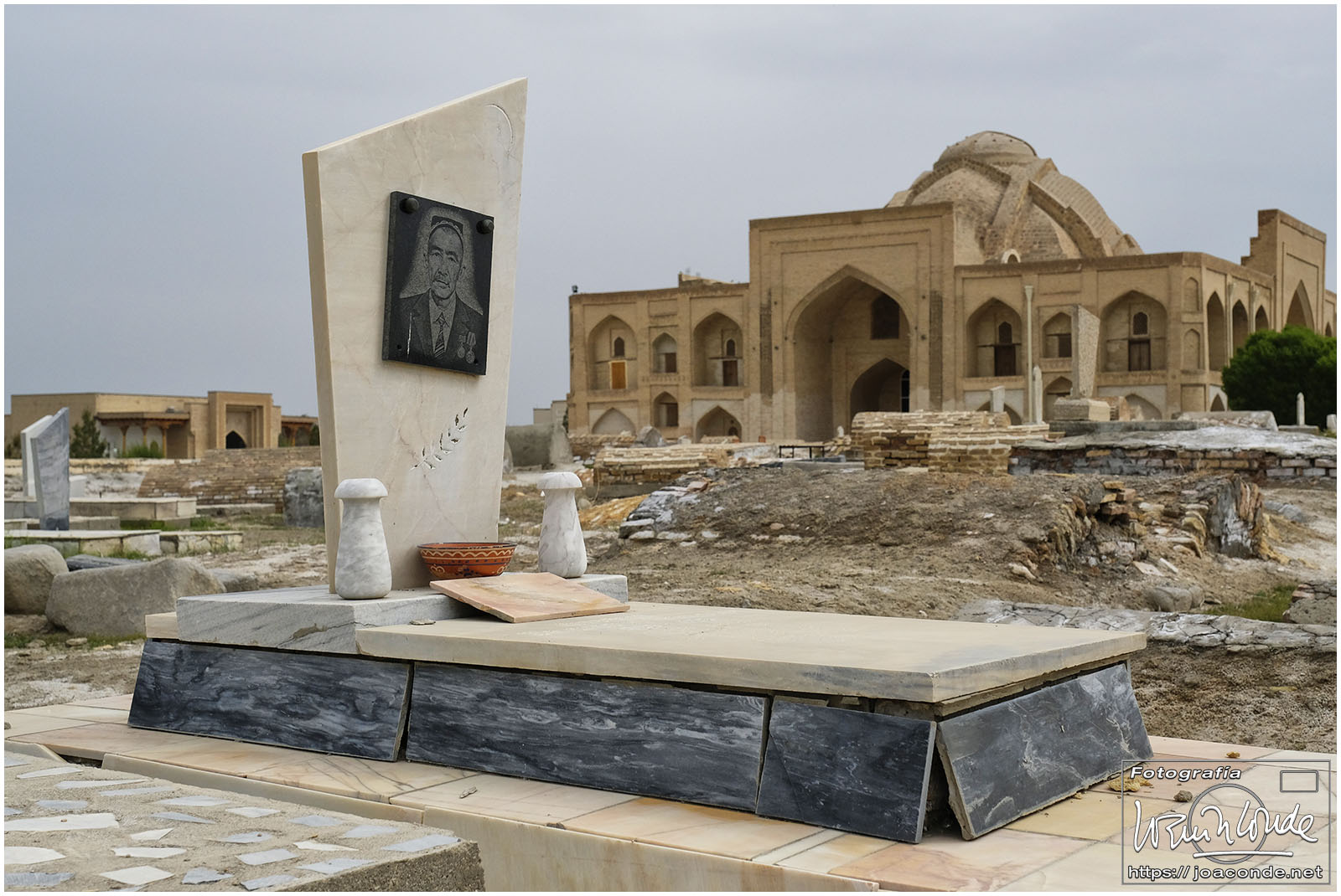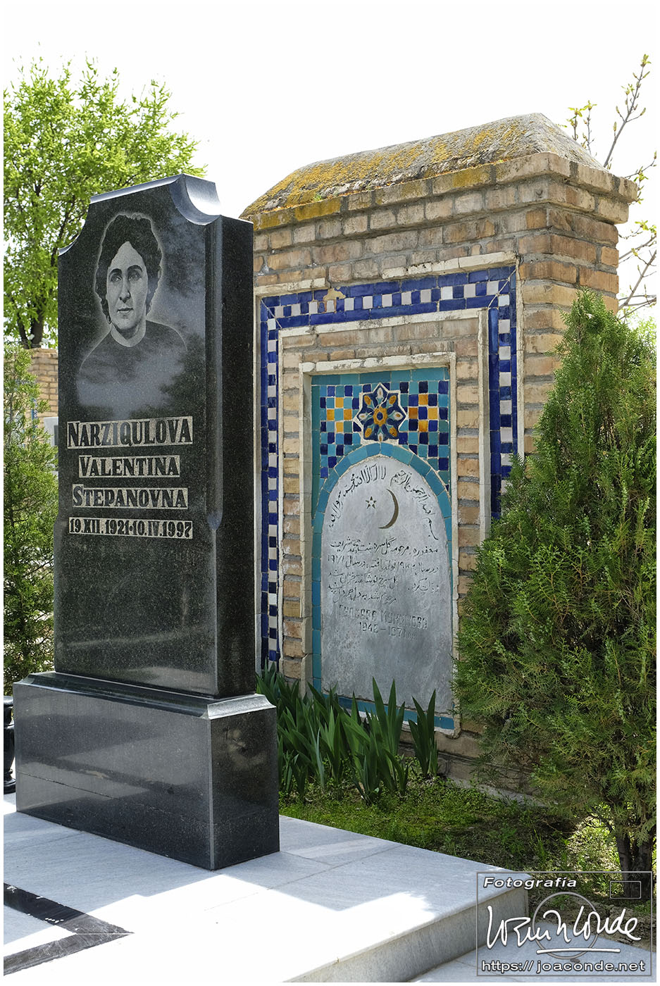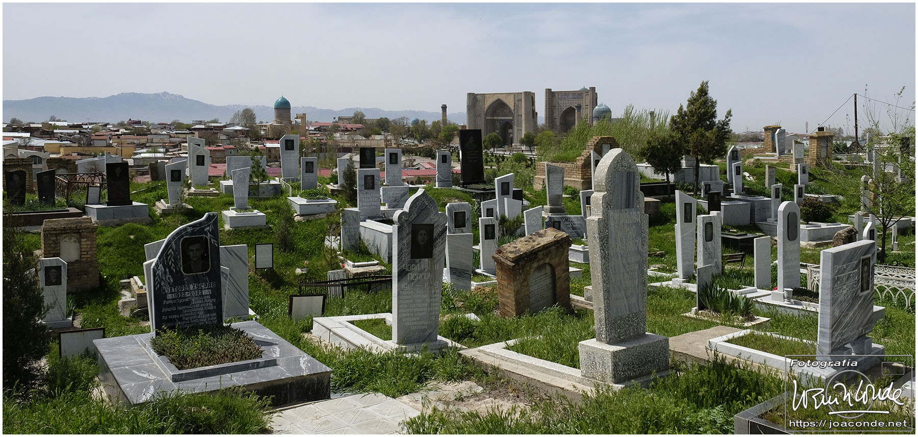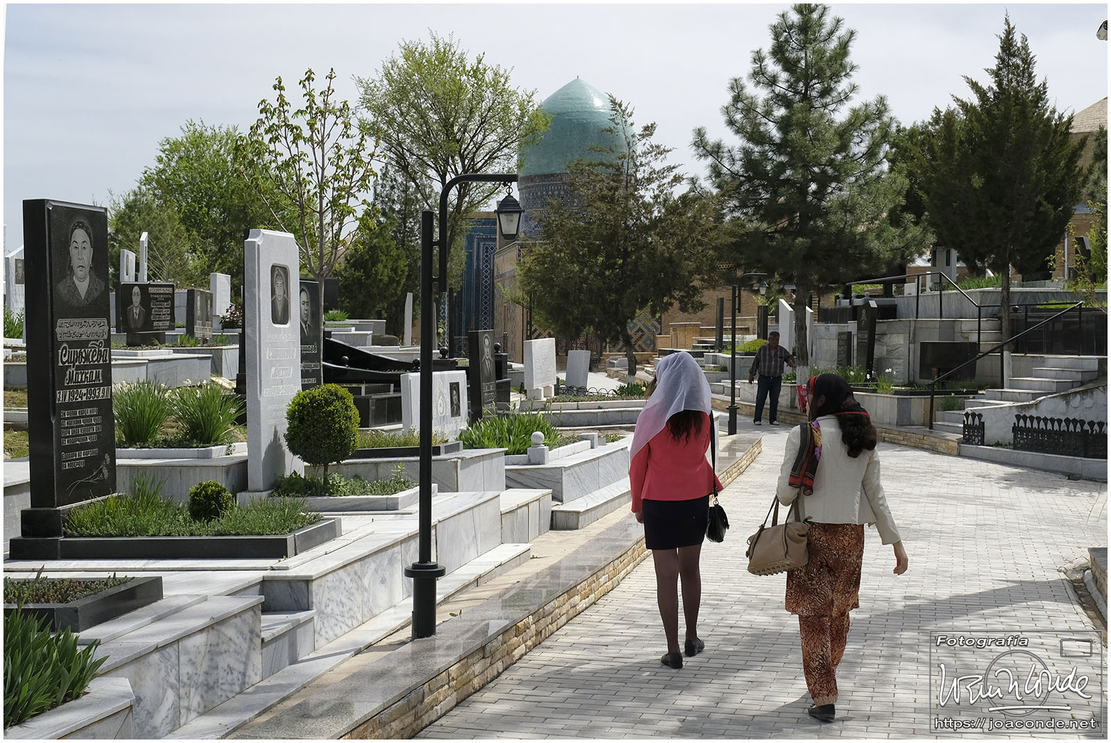 El sábado, último día en Uzbekistán, después de dejar el hotel fuimos al Observatorio de Ulugbek (s. XV) y al Museo de Afrosiyob. Terminamos las visitas en la Necrópolis Shohi Zinda (ss. XI-XVII), una infinidad de mausoleos ricamente decorados. Había muchos visitantes —incluso un grupo de cordobeses que ya habíamos visto en Bujará— y la visita fue rápida. También hice algunas fotos en el cementerio moderno que había en el recinto.