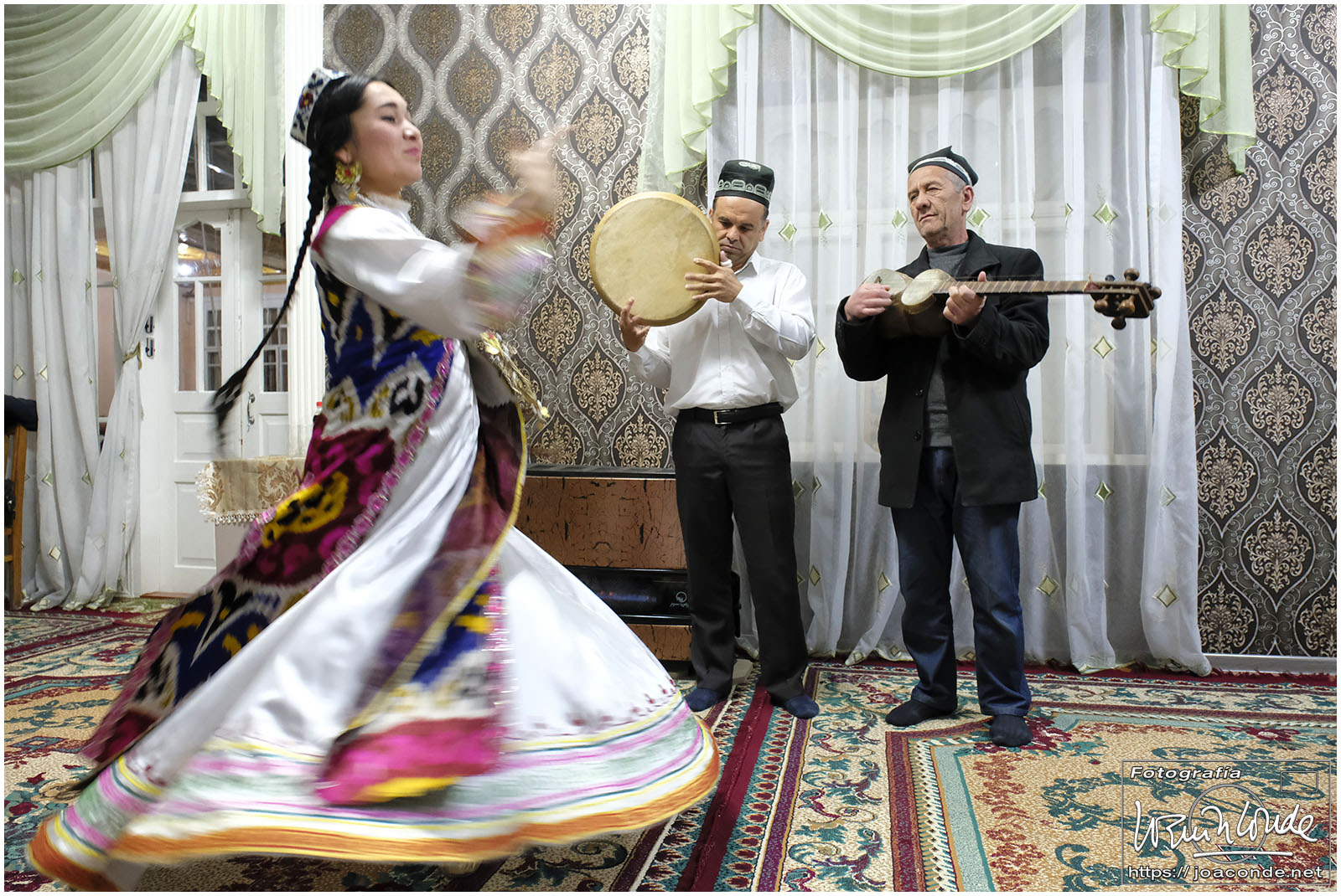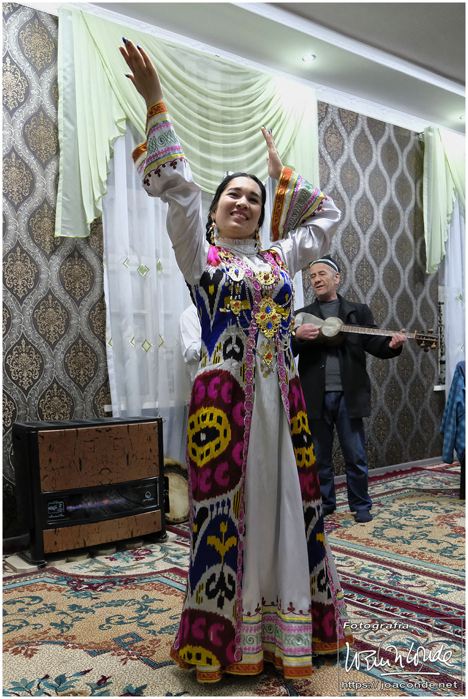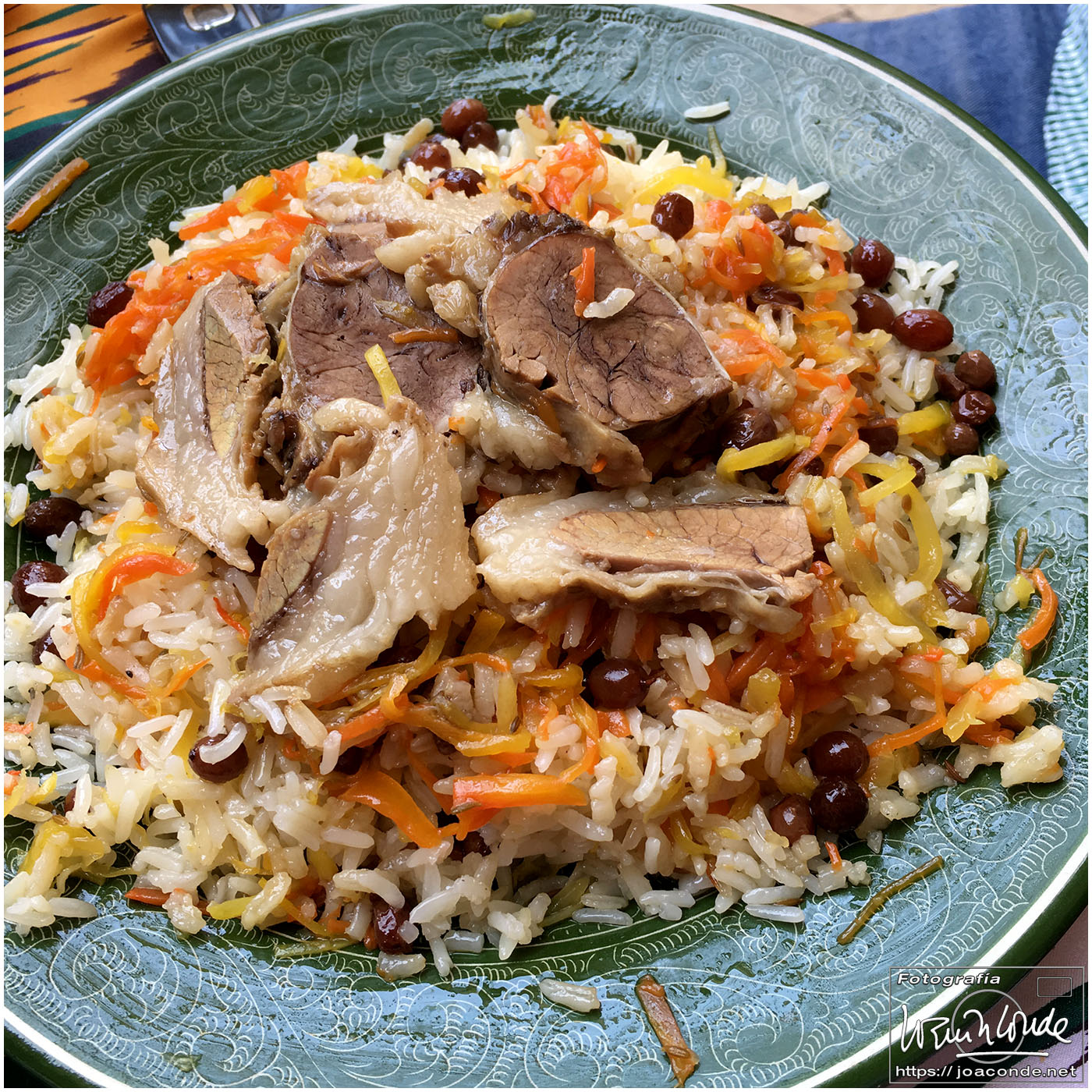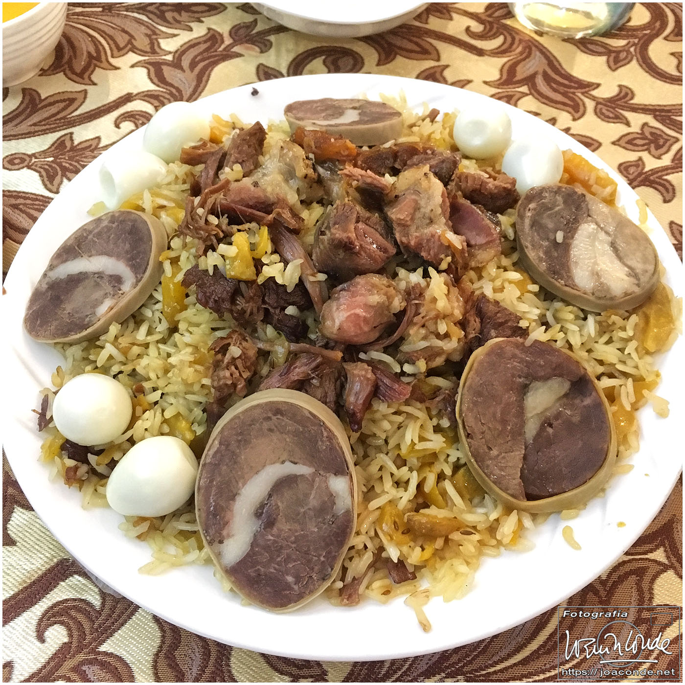 A 270 km estaba Shahrisabz, cinco horas de paisaje desértico solo animado por algunas cabras y dromedarios. Por fin llegamos a la ciudad natan de Amir Temur, el gran Tamerlán. Era impresionante lo que quedaba del Ak-Sarai (Palacio Blanco), las mezquitas de Kuk Gumbaz y Khazrati Khizr, el Conjunto Dorutt Tilovat… También vimos el Mausoleo de Djakhongir construido para el hijo mas apreciado de Temur. Comimos en el Kish-mish y seguimos camino a Samarcanda, unos cien kilómetros que hicimos en dos horas. Allí nos alojamos en el Emir Han, hotel con una peculiar decoración. Aquella noche tuvimos una cena animada con músicas y danzas locales.