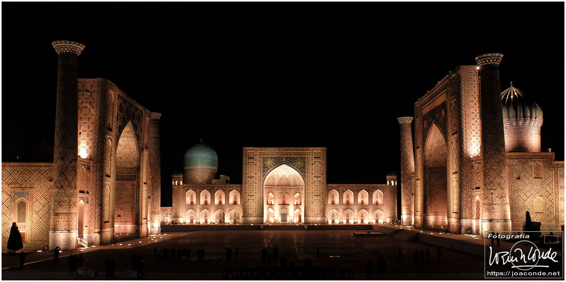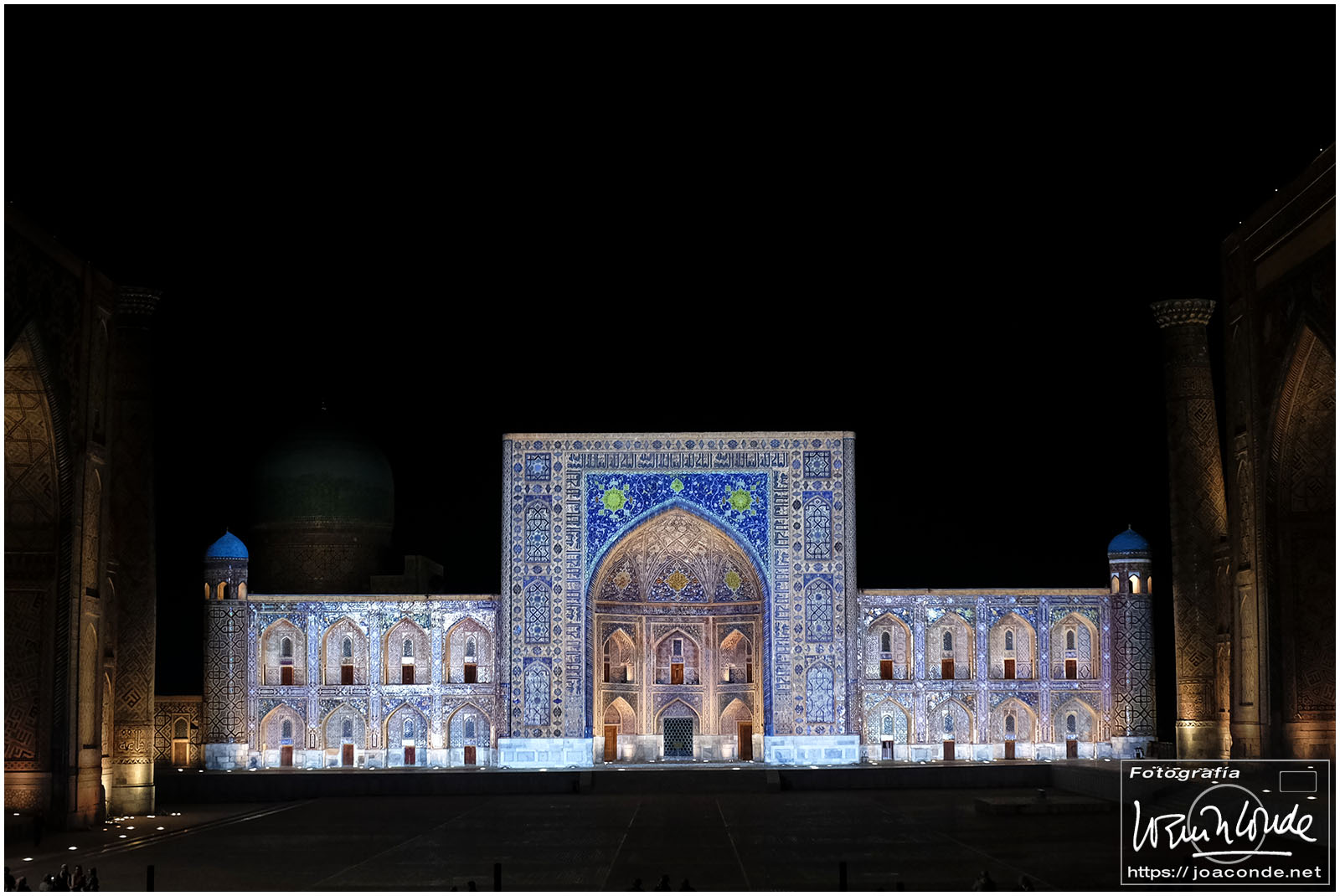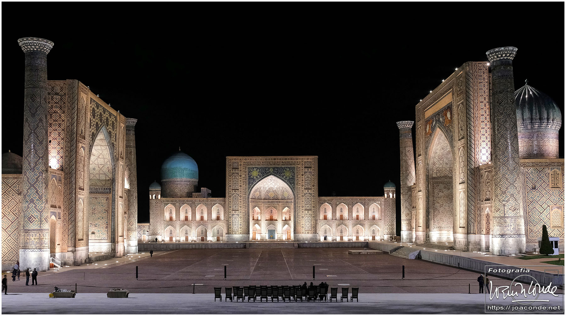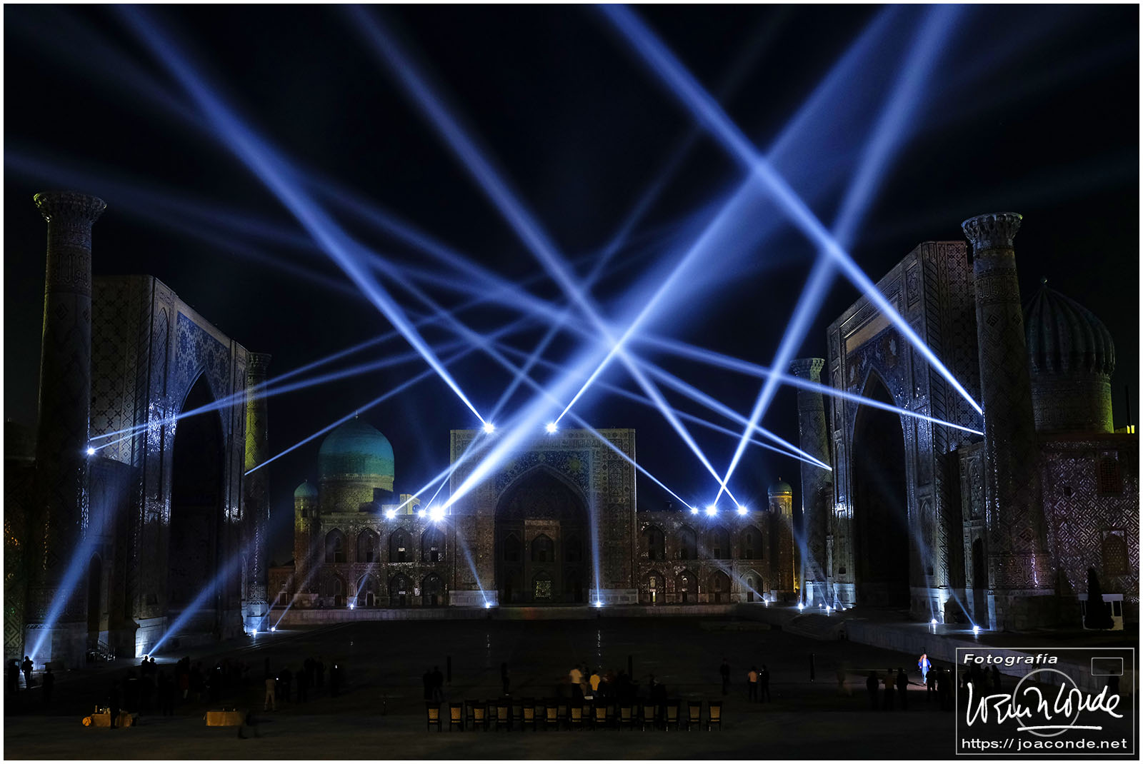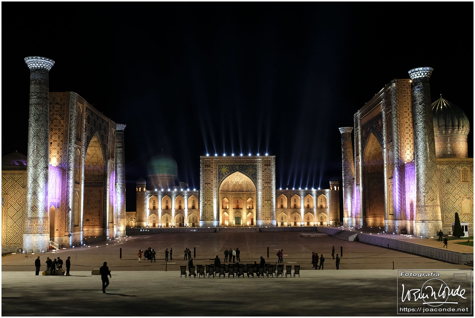 Lo mejor del viaje a Uzbekistán fue volver de noche a la Plaza Registán. Había cargado con el trípode solo para ese momento. Se preparaba un espectáculo de luz y sonido al que asistiría el presidente, pero después de varias horas de titubeos se suspendió. Eso sí, vimos toda la prueba de las luces y pude hacer cientos de fotos.